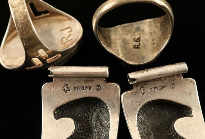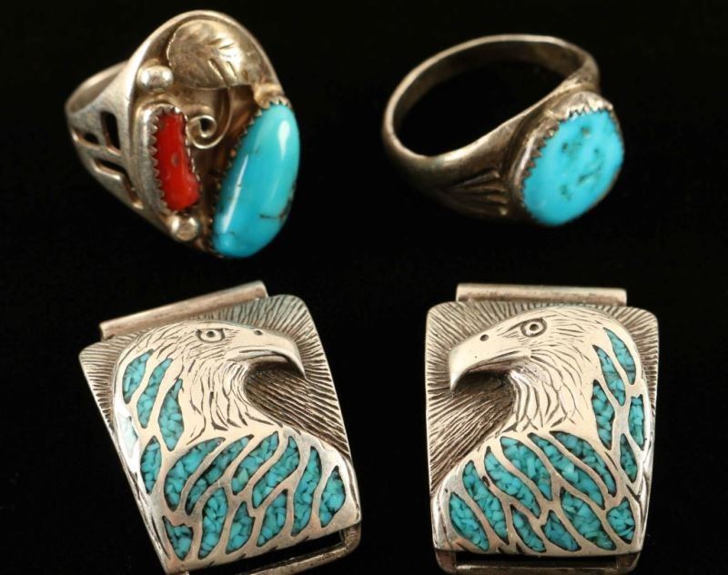 Including; (2) sterling silver watch tips with raised eagle design inlaid with turquoise chips artist signed and marked 'Sterling', ring with turquoise stone marked 'RS' and 'Sterling' size 11, and a coral and turquoise ring set in sterling silver with a leaf motif and cut out geometric designs on the side of the band marked 'RJ' size 10 1/2.