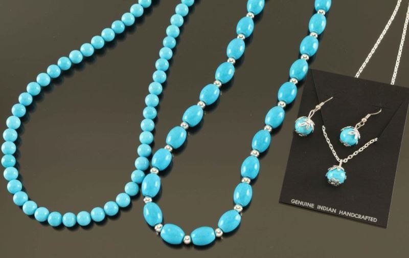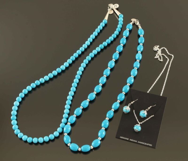Including; (1) Turquoise Silver Navajo Bead Necklace with turquoise magnesite beads (9mm x 13mm) are spaced with 5mm Sterling rounds, about 24" long including clasp made by Sharon Joe. Turquoise Magnesite Bead Necklace with beautiful Sleeping Beauty blues with random matrix on 8mm rounds dressed with silver cones and a lobster claw clasp, about 26" long also made by Sharon Joe. (3) Piece set with Native American Turquoise Silver Pendant and Earrings made with 10mm turquoise magnesite rounds that are wrapped in a delicate leaf design. Comes with a 20" silver chain and 1 1/4" long dangle earrings.