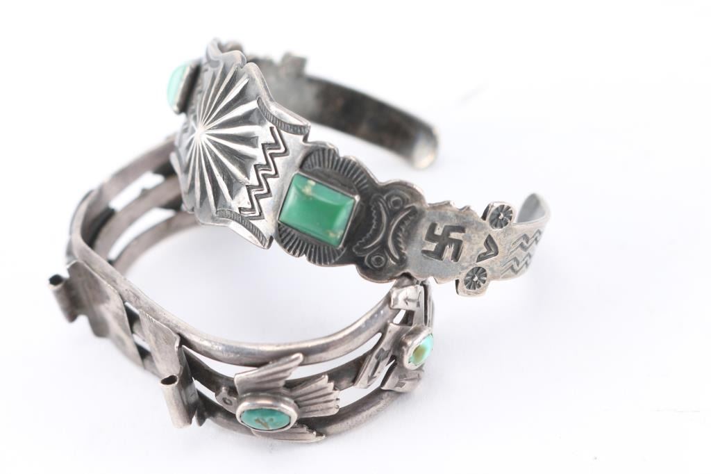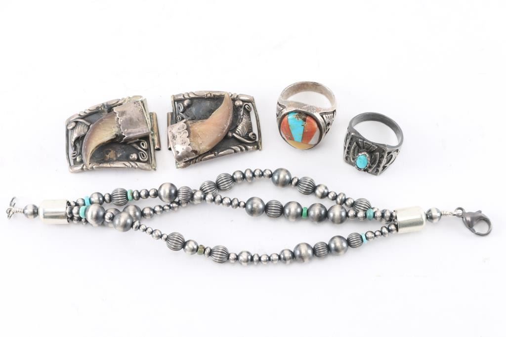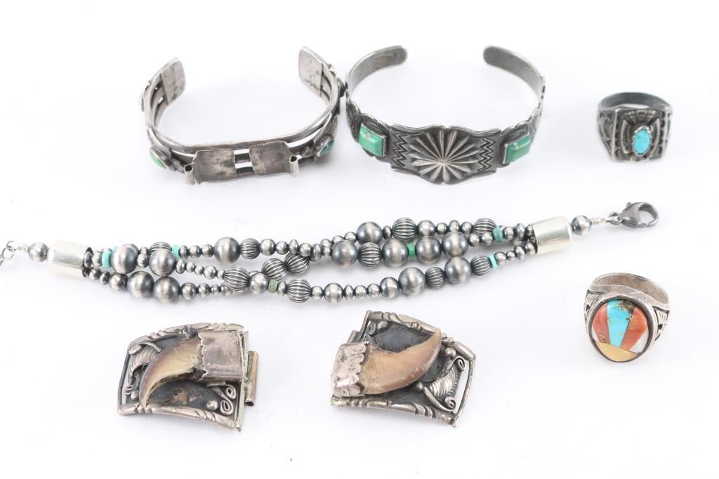 Includes Fred Harvey style sterling cuff; a thunderbird and good luck symbol watchband cuff, all sterling; Navajo pearl beaded bracelet; bearclaw and sterling watchband sides; man's sterling thunderbird ring, size 10; man's inlaid ring set, size 10, sterling.