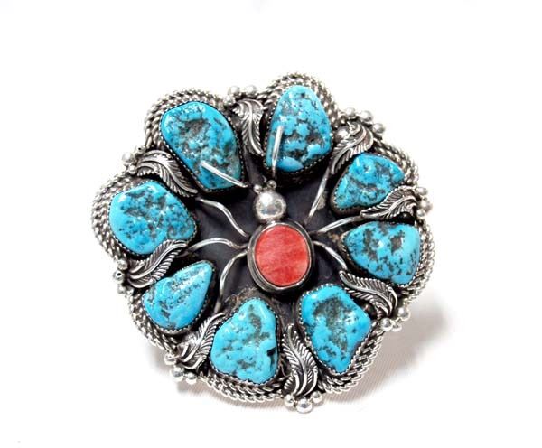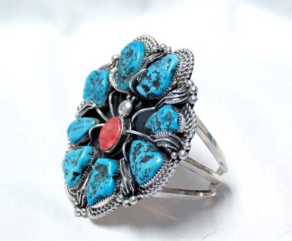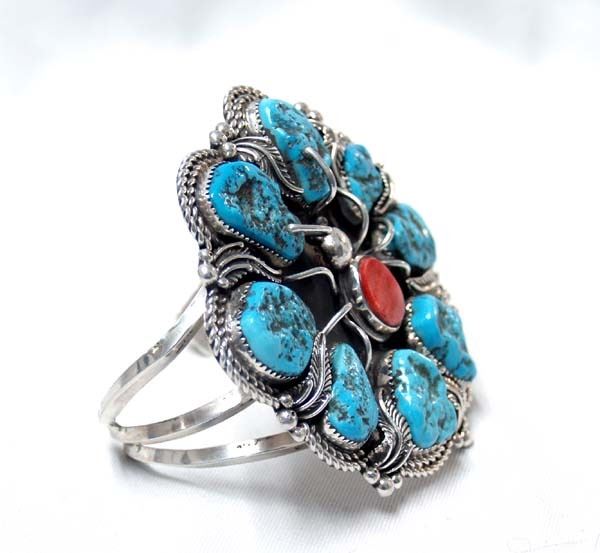 Impressive Sterling Silver, Kingman Turquoise, & Red Shell Spider Bracelet, inside measures 7'' which includes the opening x 3.5''W, hallmarked C and made by New Mexico artist, John Chavez. Bracelet is stamped sterling and features 8 stunning Kingman turquoise cabochons with the largest measuring 1''L x 5/8''W, beautiful black matrix, spider has a red shell abdomen measuring .5'' x 5/8'', 3 band, stunning silverwork, if you want a one of a kind show stopper, here it is, over 100g in total wt.