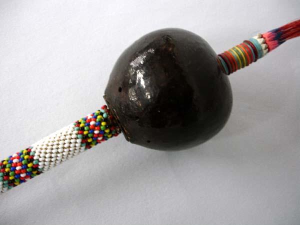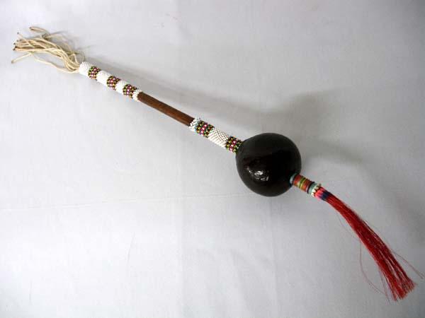 Native American Kiowa Ceremonial Gourd Rattle. Beaded handle. Measures 22'L (including tassels), with a 2.5''x2.5''. Buyers Pay Actual Shipping and Handling Charges(see terms and conditions for more information).