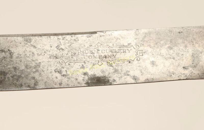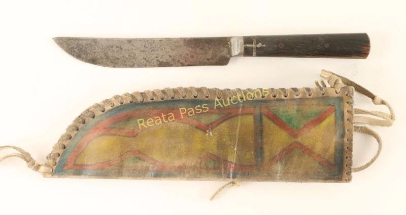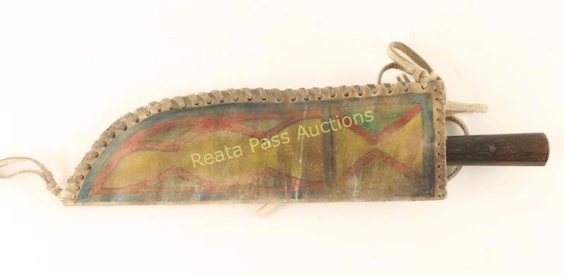 Meriden Cutlery Company wood handled knife with Parfleche sheath painted with geometric designs in red, yellow and blue.
