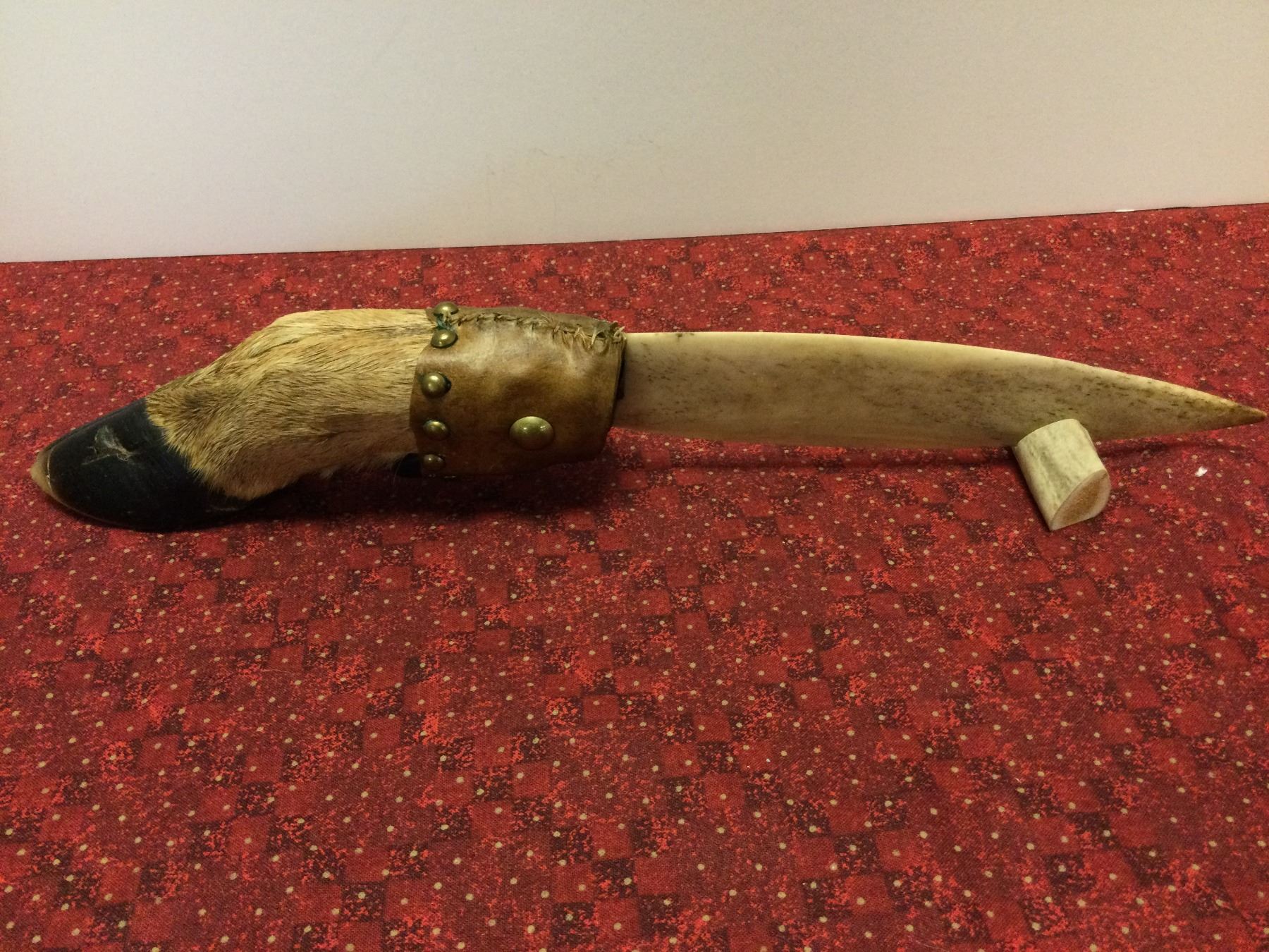 You are bidding on a handmade Native American Knife made from a deer hoof and a deer rib bone polished blade, a fantastic conversation piece and a great piece of Americana