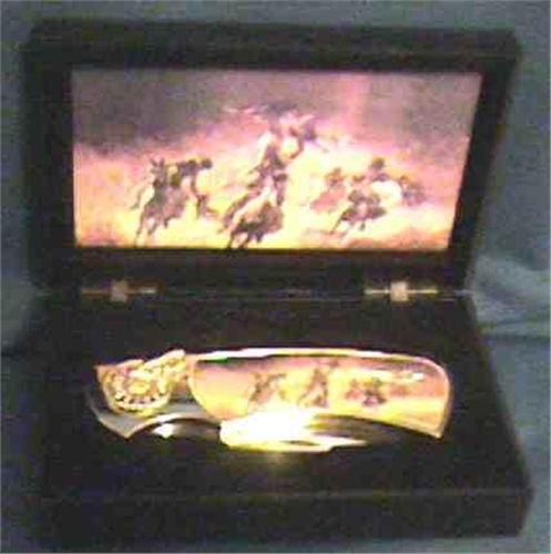 7 Inch Warpath Folding Lockblade w/case. Warriors on attack decorate this 7 inch folding lockblade knife. Sepatone western colors & knife adorned with goldtone Headdress. Stainless Steel wide blade. 5 inch by 3 1/2 inch by 1 1/2 inch black plastic molded felt-lined case.