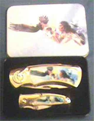 Warrior and Eagle Dual Knife set w/metal case. A lone Warrior and his Totem Eagle decorate this dual matched knife set. One 7 inch folding lockblade and one 5 inch folding lockblade w/serrated blade. Stainless steel blades. Goldtone Headdress decorations. Fitted metal felt-lined case.