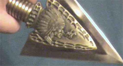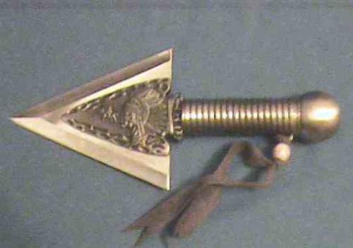 Indian Chief Arrowhead Knife w/leather sheath. Magnificient, unusual knife features an arrowhead shaped dual edge blade. Solid metal Indian Chief with mounted horse in background decorated the blade. Wrapped metal handle w/leather straps. Hollow ground edges. A very heavy, impressive knife completer with fitted leather sheath and leather spangles.