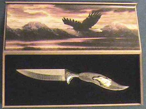 9 Inch Eagle Feather knife with plastic case. Classic Native American 9 inch Feather knife with decorated blade and bas-relief solid metal eagle on handle. This knife can also be used as a totem knife. Solid metal, hollow ground decorated blade, fitted plastic felt-lined case makes this a remarkable knife.