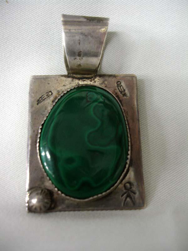 Native American Large Malachite Sterling Pendant. Hallmark on back ''TJ & EI''. Measures 1.25''x1.65'' (not including bale). Buyers Pay Actual Shipping and Handling Charges(see terms and conditions for more information).