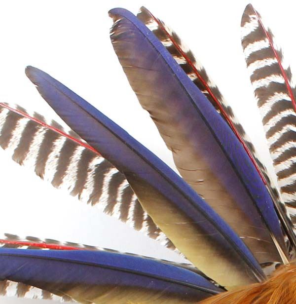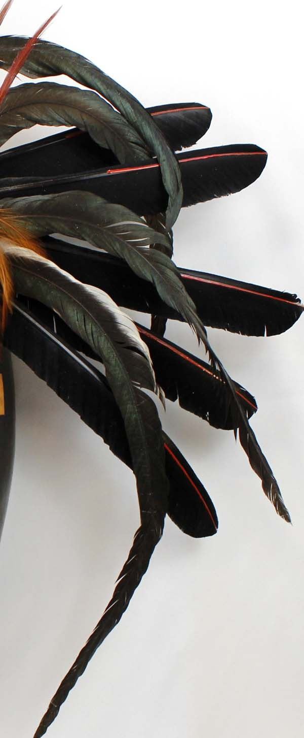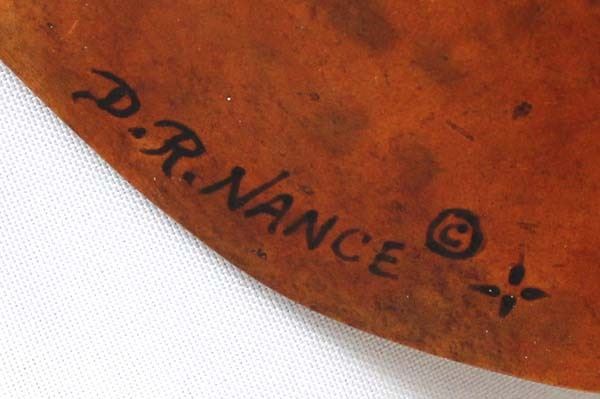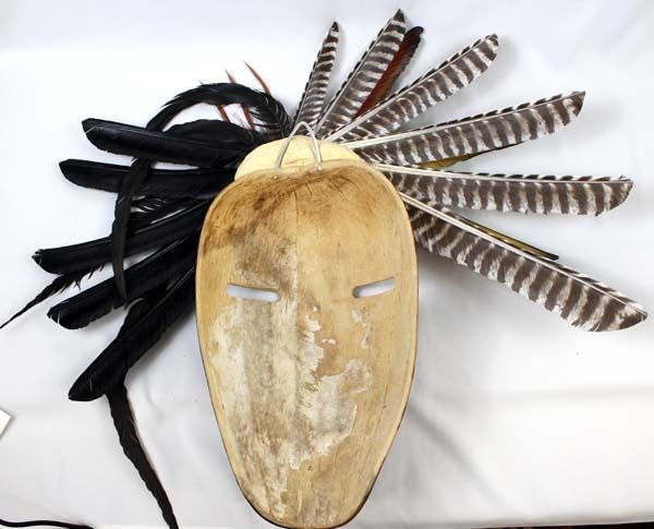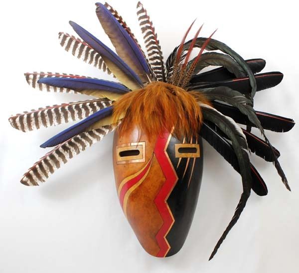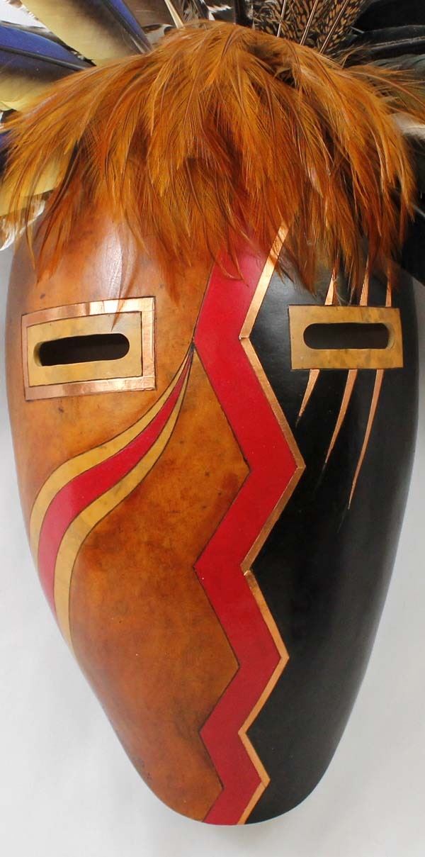 Native American Lumbee Gourd Mask by D. R. Nance, measures 29'' x 25'' x 5'' and is signed, embellished with feathers and copper leaf accents, ''D. R. Nance is a Native American (Lumbee) artist who has earned his fame making masks. He paints dried gourds and attaches a colorful array of natural feathers to match. D.R. Nance, of Lumbee Indian decent, grew up in the ''Piney Woods'' of East Texas, riding horses and being a cowboy. His desire to work with natural elements began early in his life. His Shawnee grandmother encouraged his youthful artistic inclinations, but as he matured and experienced the demands of raising a family, he put his art aside and worked in the oil fields of Texas. After 20 years of working, he once again followed his heart and returned to his passion of makings things with his hands. In 1993, D.R. went to a gourd farm, and he immediately began working with them. Gradually, he developed his unique style, which reflects his influence of the ancient Native American artists of New Mexico, Arizona and Mexico. D.R., now an accomplished artist, creates powerful art as each uniquely shaped gourd speaks to him, inspiring him to burn designs and images into the outer skin and then to apply dye, paint, feathers, turquoise and metal inlay, native beads, antlers and leather. What is created is an image that speaks beyond itself, bringing the magic of art as a transformational media to the enhanced piece. Diverse in his offering, D.R. makes feathered masks, purses, spirit dolls and medicine bowls. Each unique piece brings the power of the spiritual world and elements of nature to offer rare gifts of beauty and power.''