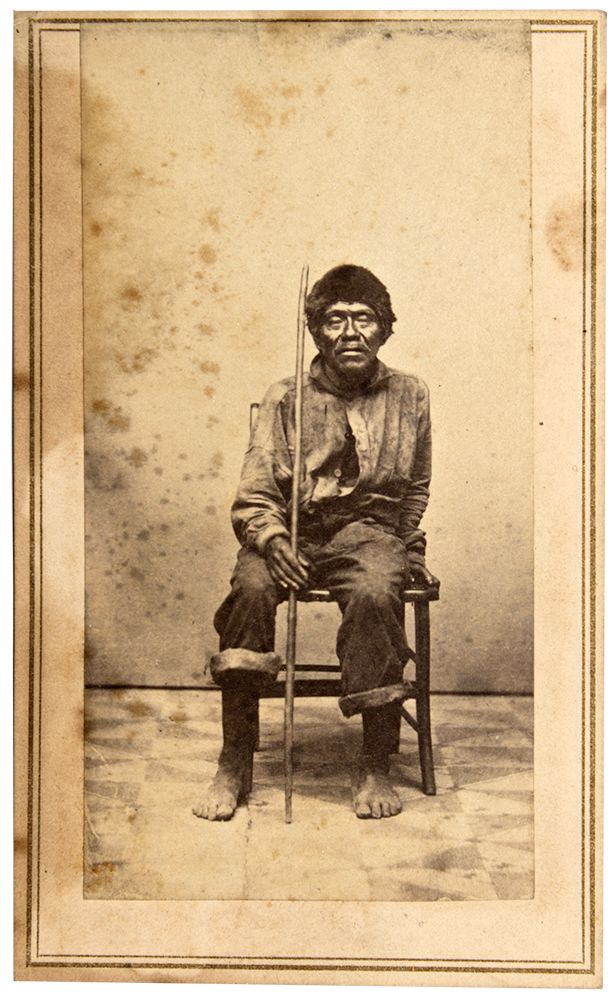 c1875 This small photograph measures 4” x 2.5” mounted on white mat. Medium contrast and focus is sharp. There are brown age marks that appear on the left and upper right sides. The sides of the mat have little wear. On the back on the mat there is a message in period handwriting that reads “Digger Indian.” It is therefore unknown the tribal group the man in the photograph was associated with. The term “digger Indian” was created by Euro Americans as a generalized stereotypical definition loosely applied to Natives whom they believe dug for food. Therefore, the term was applied to many Northern Nevadan and Central Californian Natives, despite their cultural differences. The man sits for a photograph in a chair, holding a stick. He is barefooted and wears Euro American clothing. [Ref: Lonnberg, Allan. “The Digger Indian Stereotype in California”, Journal of California and Great Basin Anthropology, p. 215. 1981]. - HKA#63003