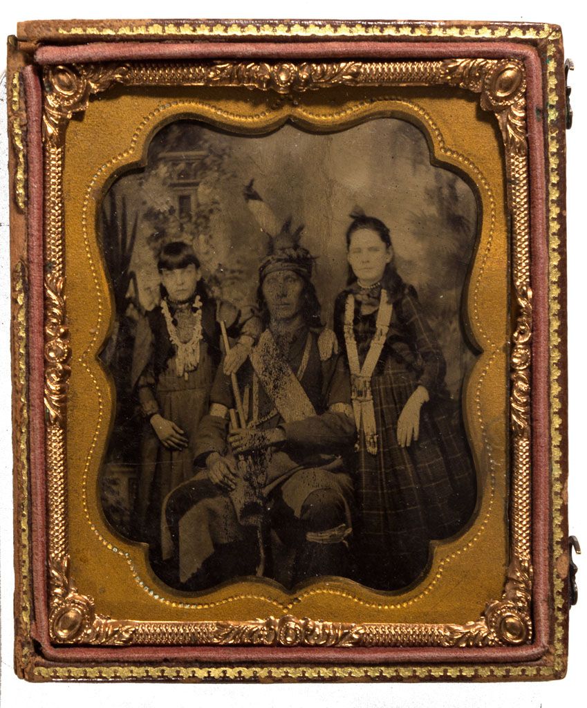 1860 - Photograph measures 2.25” x 2.75” and 3” x 3.5” in holder. Dark to medium contrast and focus is sharp, but blurred in some spots. There is some wear on the photograph and the holder. The holder was once connected to another, but has since been detached. The photograph shows a man, possibly Sioux, with two young girls. Photographer is unknown, therefore the official tribal identify of the man remains unknown. Based on the man’s attire in comparison with other Native photographs, it’s possible he was Yankton or Santee Sioux. The girls are dressed in Euro-American clothing, but wear Native beadwork around their necks [Ref: http://beinecke.library.yale.edu/dl_crosscollex/SetsSearchExecXC.asp?srchtype=ITEM]. -61335