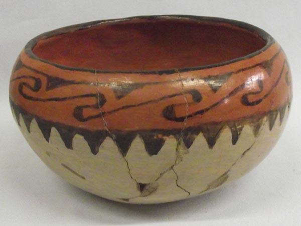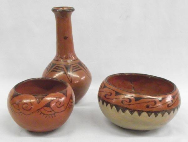 Native American Maricopa Pottery, 2 bowls (one bowl has been glued and missing small piece) and 1 vase (has been glued), 2 bowls by Ida Redbird, Vase is by Mabel Sunn...Mabel Sunn, b. 1898-d.1980. One of the original members of the Maricopa Pottery Cooperative formed in 1937 by Elizabeth Hart, Mabel Sunn along with Ida Redbird and Mary Juan were encouraged to improve the quality of the pottery to an art form rather than just make trinkets for the tourists. Mabel is also the subject of Mary Fernald's wonderful book ''Dirt for Making Things'' which explores the 20th century history of pottery making by the Maricopa Indians., 1 bowl was chip out of rim, largest measures approx. 7 7/8'' x 5.5''. Buyers Pay Actual Shipping and Handling Charges(see terms and conditions for more information)