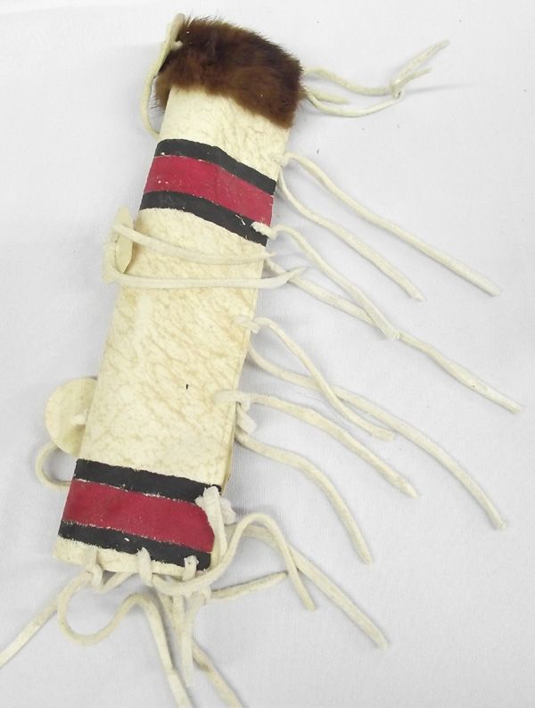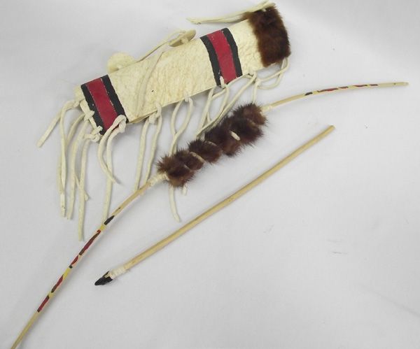 Native American Miniatue Parfleche, Bow and Arrow. Dried Leather and hand painted. Bow measures 20''L. Nice for display or for a child.
