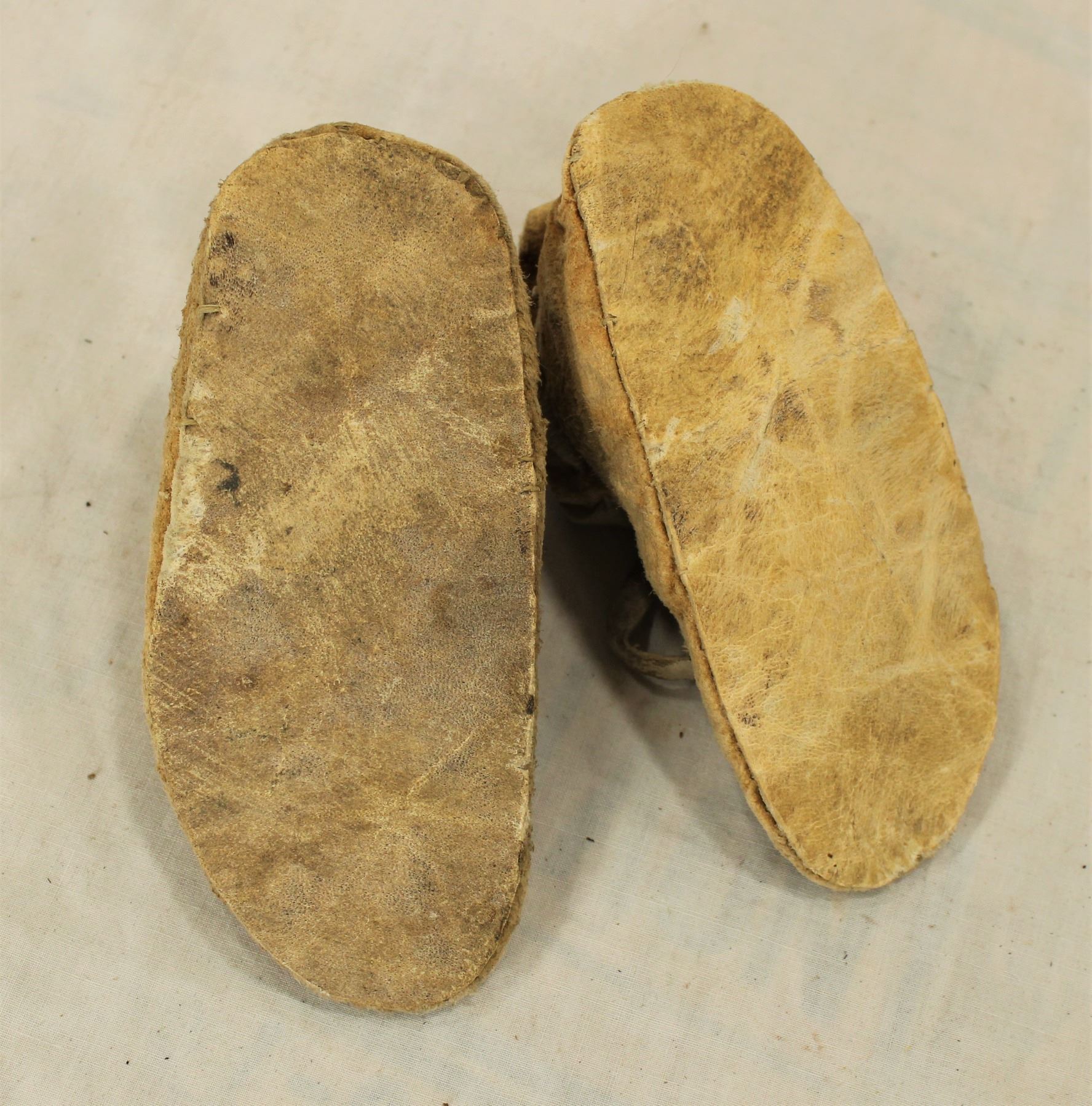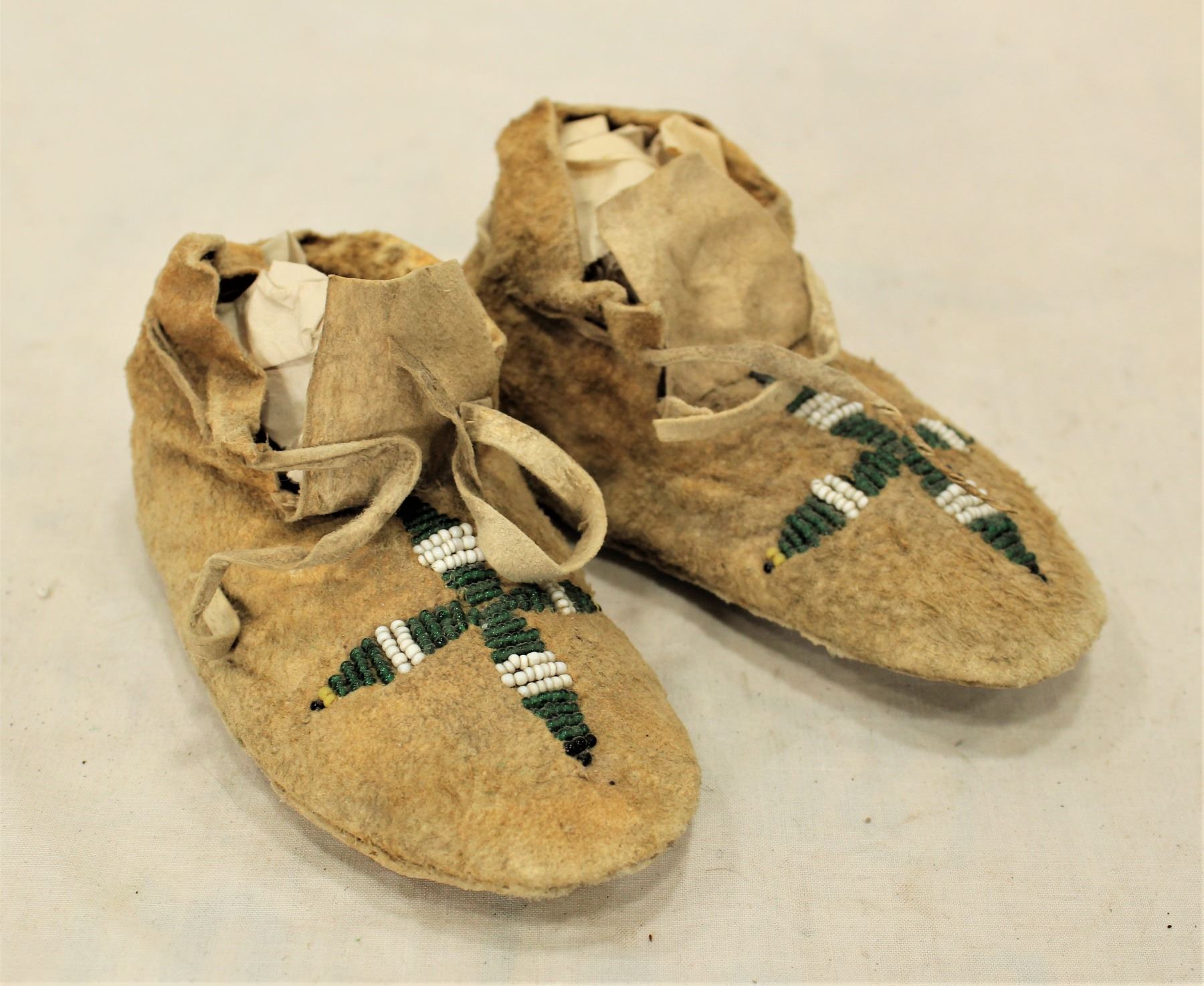 Two pair of Plains Indian moccasins, one brightly beaded youth size, and one early beaded infant size.