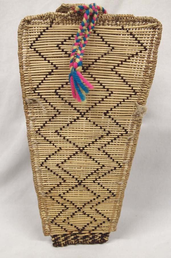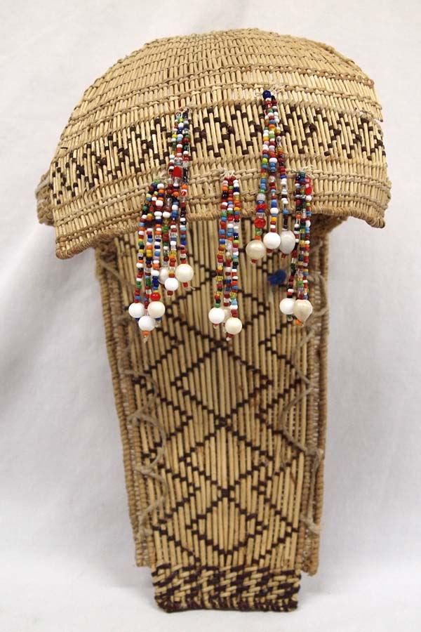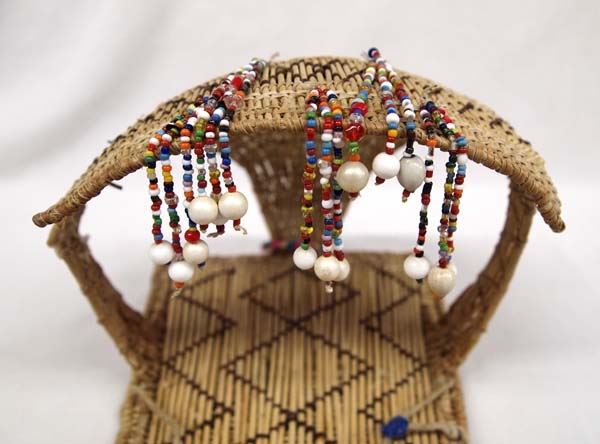 Native American Mono Paiute Doll's Cradleboard, woven basketry, embellished with beads, measures 12.5''L x 7''W x 6''Deep