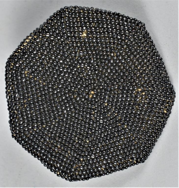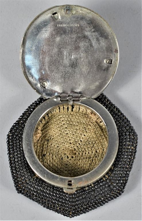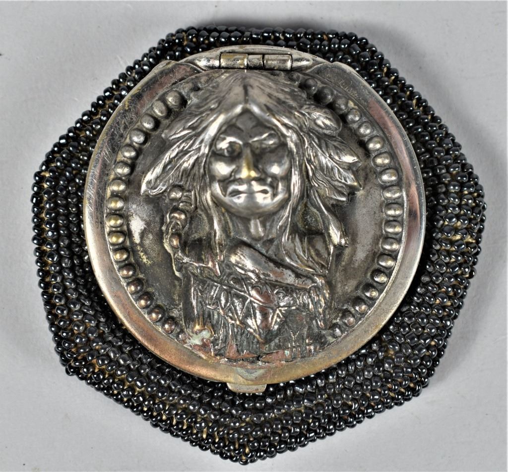 Native American Motif Beaded Coin Purse. Embossed nickeled plated image of Indian chief on front and nickel plated frame. Tight weave pewter seed beads make up pouch. Some very slight corrosion at 6:00 otherwise very good overall condition. 3 inch diameter.