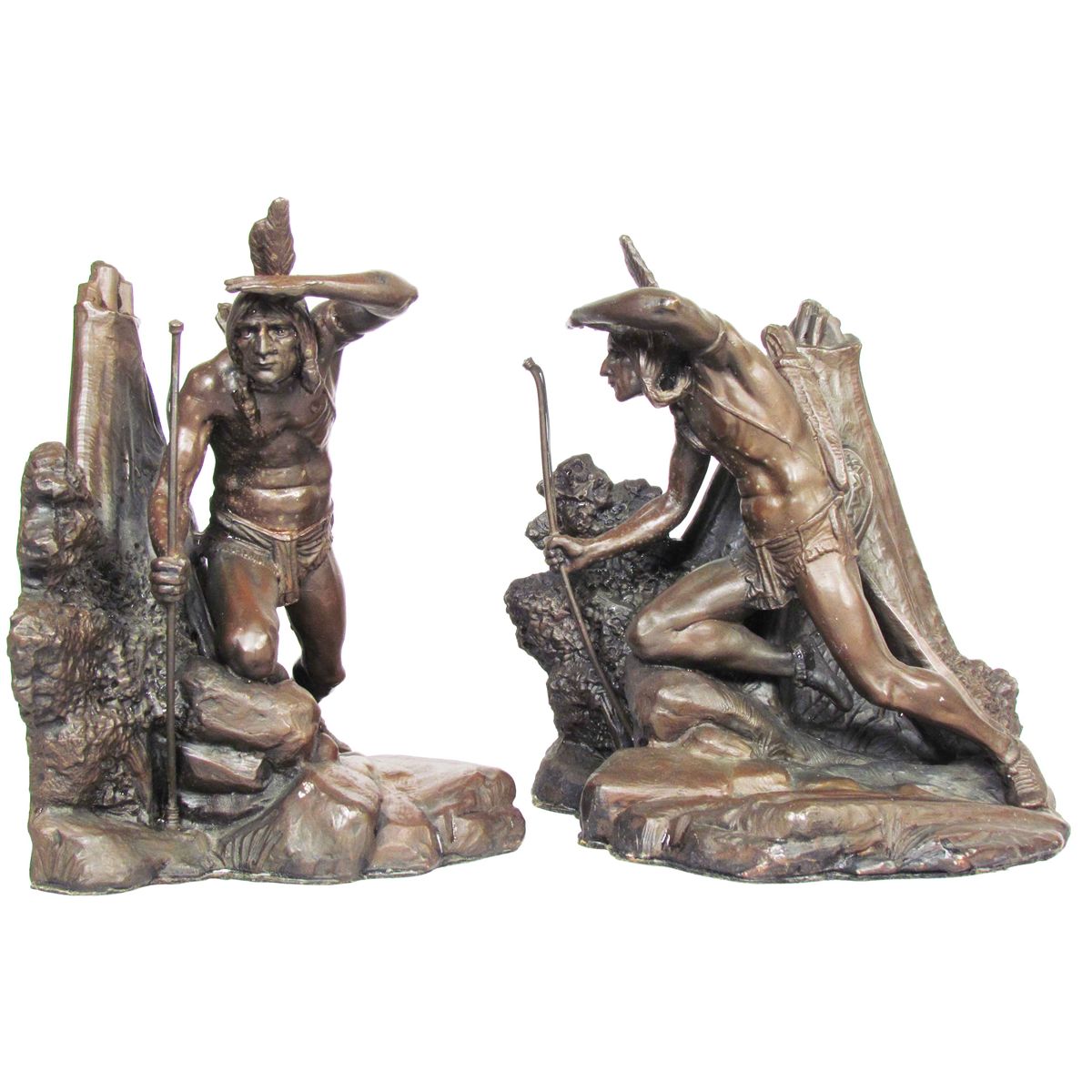 Pair of Bronze Bookends depicting Native American Searching. Very good condition. 7 1/4 X 8 X 5 1/2 inches each.