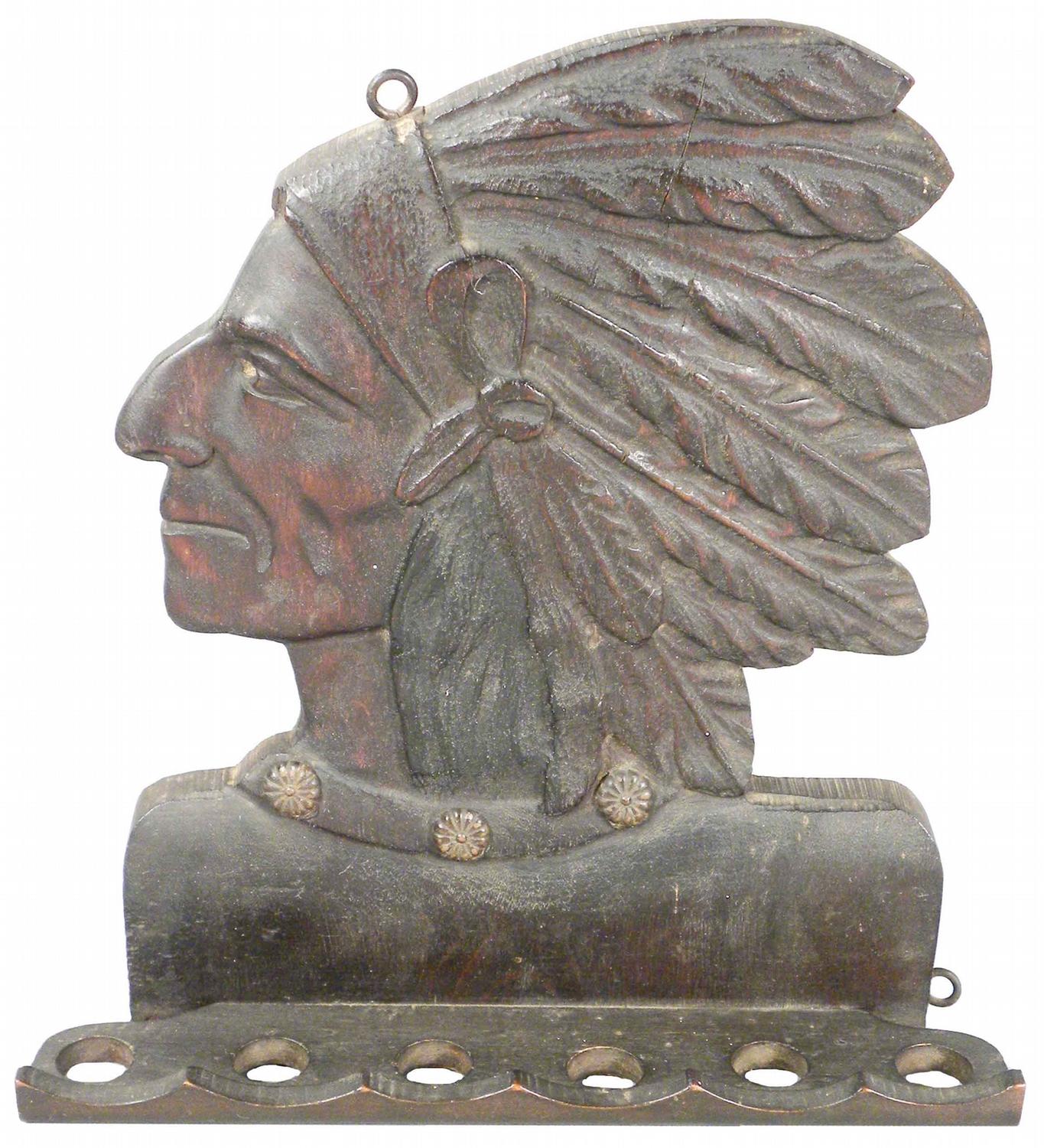 Native American Motif Hand Carved Oak Pipe Holder. Excellent condition. 11 X 12 X3 inches.