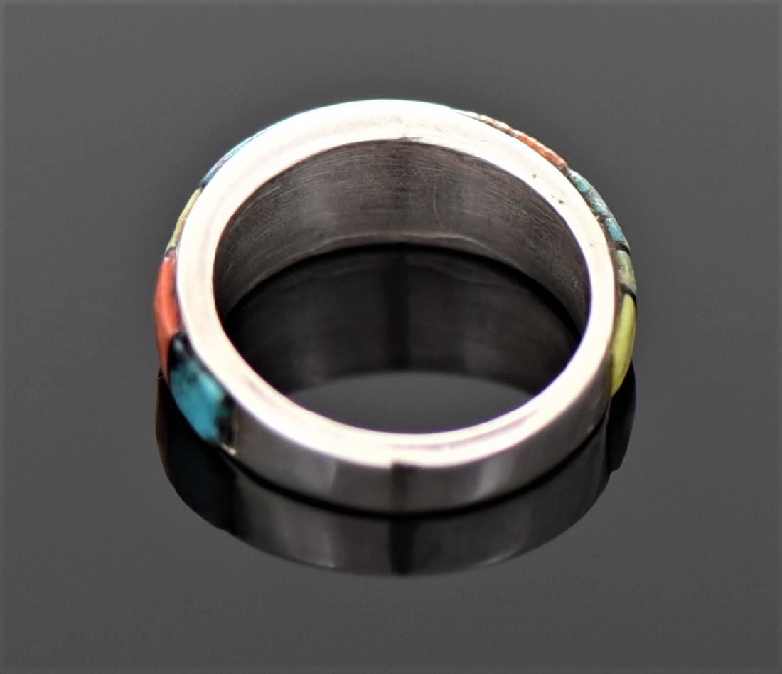 Native American Multi Stone Sterling Silver Ring With Red Coral, Fire Opal, And Blue And Green Turquoise Stones. Silver Tested. Ring Size 7. Estimated less than 50 yrs old. Native Americans also known as American Indians or just simply Indians are considered to be people whose pre-Columbian ancestors were indigenous to the lands within the nation's modern boundaries. These peoples were composed of numerous distinct tribes, bands, and ethnic groups, and many of these groups survive intact today as partially sovereign nations. The Iroquois, living around the Great Lakes and extending east and north, used strings or belts called wampum that served a dual function: the knots and beaded designs mnemonically chronicled tribal stories and legends, and further served as a medium of exchange and a unit of measure. The keepers of the articles were seen as tribal dignitaries. Pueblo peoples crafted impressive items associated with their religious ceremonies. Kachina dancers wore elaborately painted and decorated masks as they ritually impersonated various ancestral spirits. Sculpture was not highly developed, but carved stone and wood fetishes were made for religious use. Superior weaving, embroidered decorations, and rich dyes characterized the textile arts. Both turquoise and shell jewelry were created, as were high-quality pottery and formalized pictorial arts. Navajo spirituality focused on the maintenance of a harmonious relationship with the spirit world, often achieved by ceremonial acts, usually incorporating sand painting. The colors made from sand, charcoal, cornmeal, and pollen depicted specific spirits. These vivid, intricate, and colorful sand creations were erased at the end of the ceremony. (Wikipedia) Size and/or Weight: See Measurement Photo. (Photos Represent The Lot Condition.)
