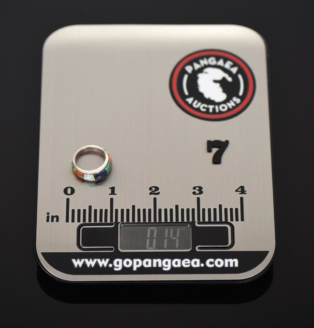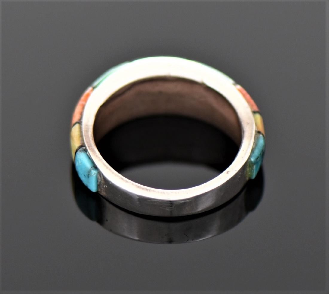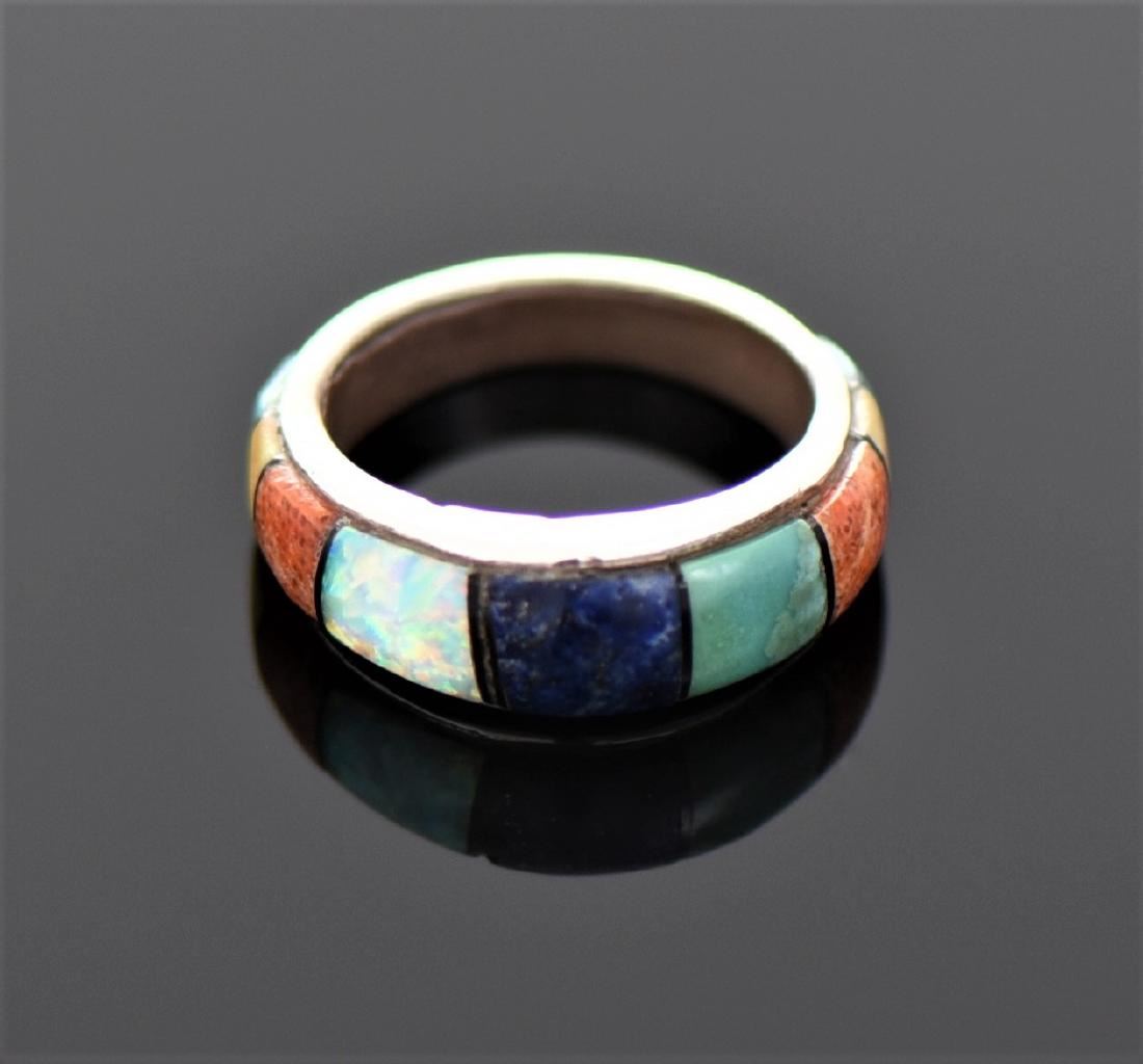 Native American Multi Stone Sterling Silver Ring With Red Coral, Fire Opal, Lapis Lazuli, Spiny Oyster And Blue Turquoise Stones. Silver Tested. Ring Size 7. Estimated less than 50 yrs old. Native Americans also known as American Indians or just simply Indians are considered to be people whose pre-Columbian ancestors were indigenous to the lands within the nation's modern boundaries. These peoples were composed of numerous distinct tribes, bands, and ethnic groups, and many of these groups survive intact today as partially sovereign nations. The Iroquois, living around the Great Lakes and extending east and north, used strings or belts called wampum that served a dual function: the knots and beaded designs mnemonically chronicled tribal stories and legends, and further served as a medium of exchange and a unit of measure. The keepers of the articles were seen as tribal dignitaries. Pueblo peoples crafted impressive items associated with their religious ceremonies. Kachina dancers wore elaborately painted and decorated masks as they ritually impersonated various ancestral spirits. Sculpture was not highly developed, but carved stone and wood fetishes were made for religious use. Superior weaving, embroidered decorations, and rich dyes characterized the textile arts. Both turquoise and shell jewelry were created, as were high-quality pottery and formalized pictorial arts. Navajo spirituality focused on the maintenance of a harmonious relationship with the spirit world, often achieved by ceremonial acts, usually incorporating sand painting. The colors made from sand, charcoal, cornmeal, and pollen depicted specific spirits. These vivid, intricate, and colorful sand creations were erased at the end of the ceremony. (Wikipedia) Size and/or Weight: See Measurement Photo. (Photos Represent The Lot Condition.)
