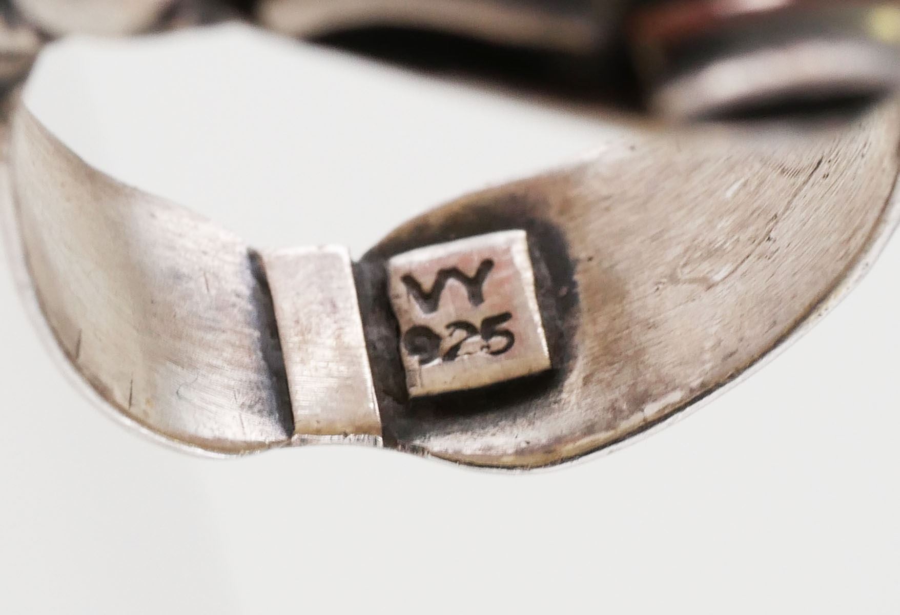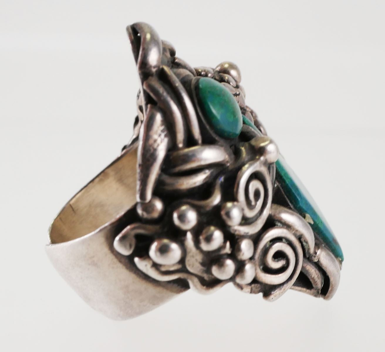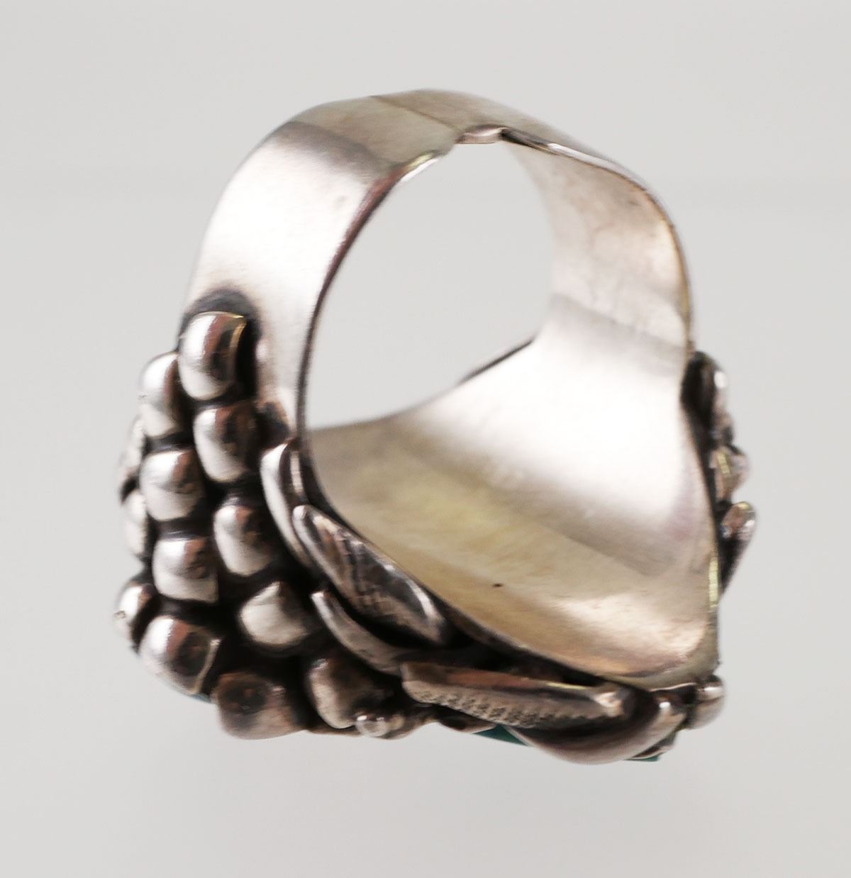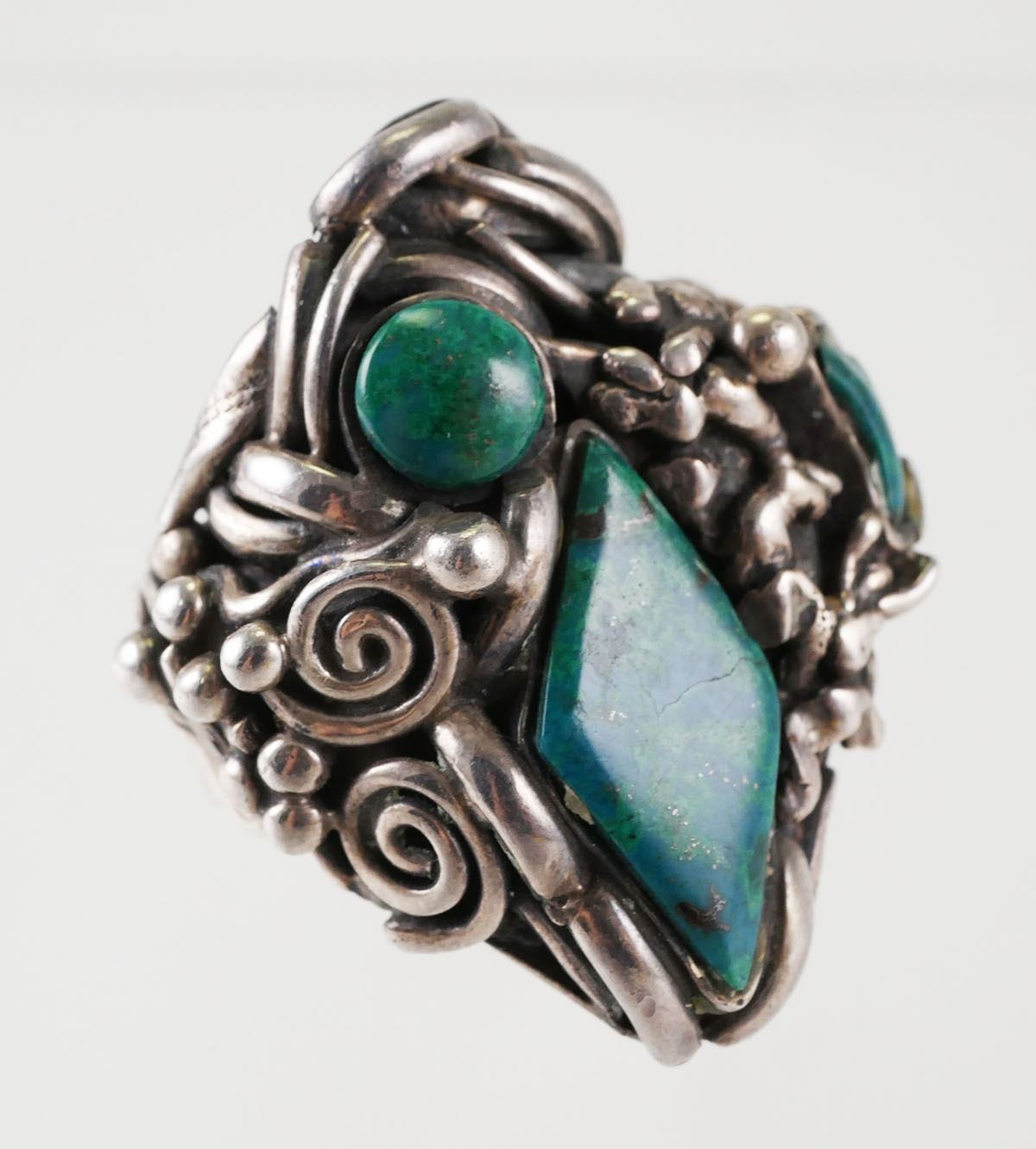 Native American Southwestern Navajo sterling silver & turquoise ring with scroll & bead design. Signed "W" and marked 925 on inside of band. Ring is size 7, overall weight is 20.3 grams. The ring is in good condition with light wear & tarnish, see photos for more details on condition.