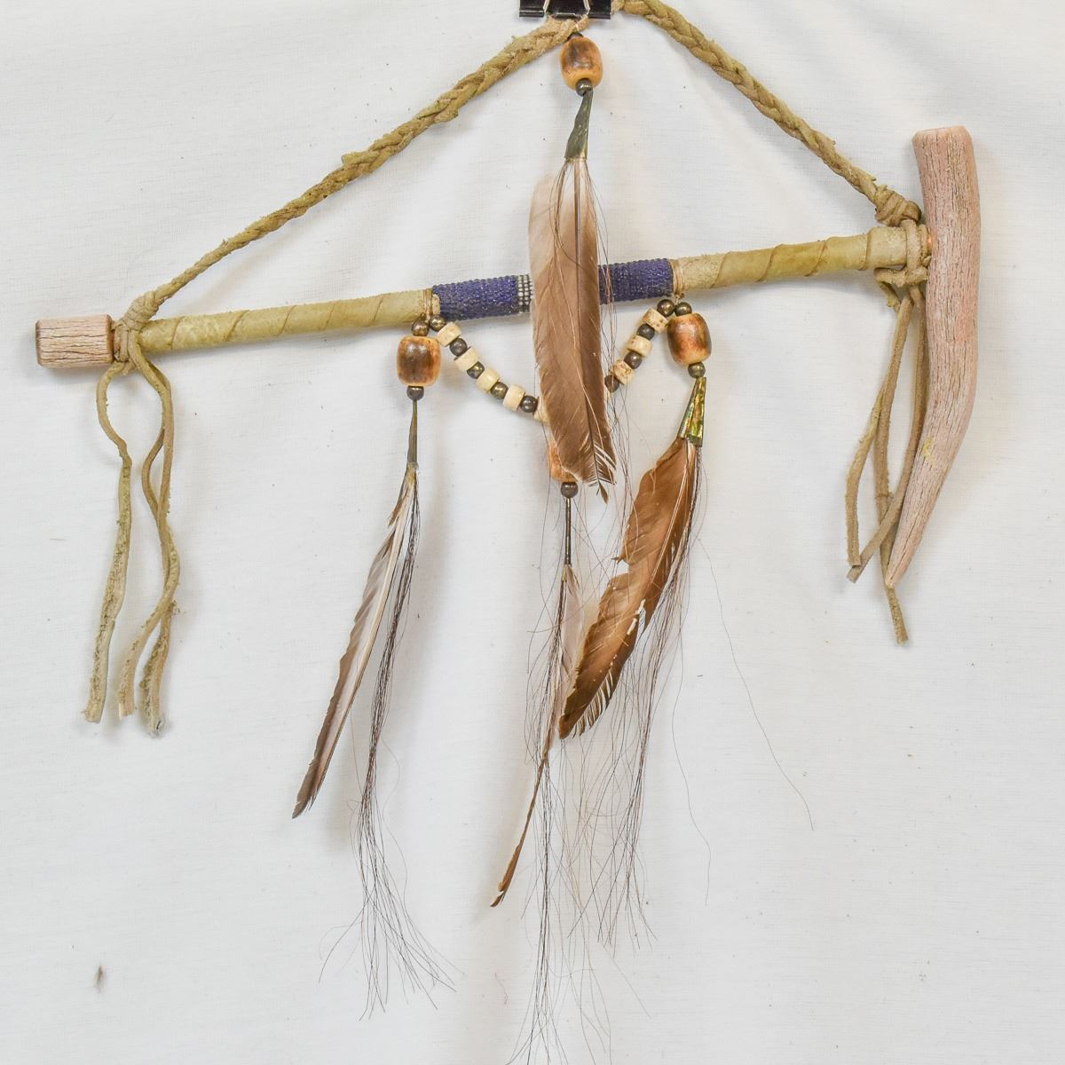 Native American Navajo Antler Pipe, measures 7" x 12", embellished with brass, bone, and wood beads, feathers, and leather