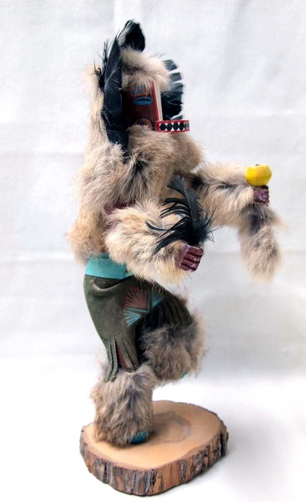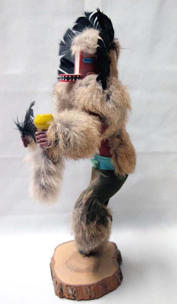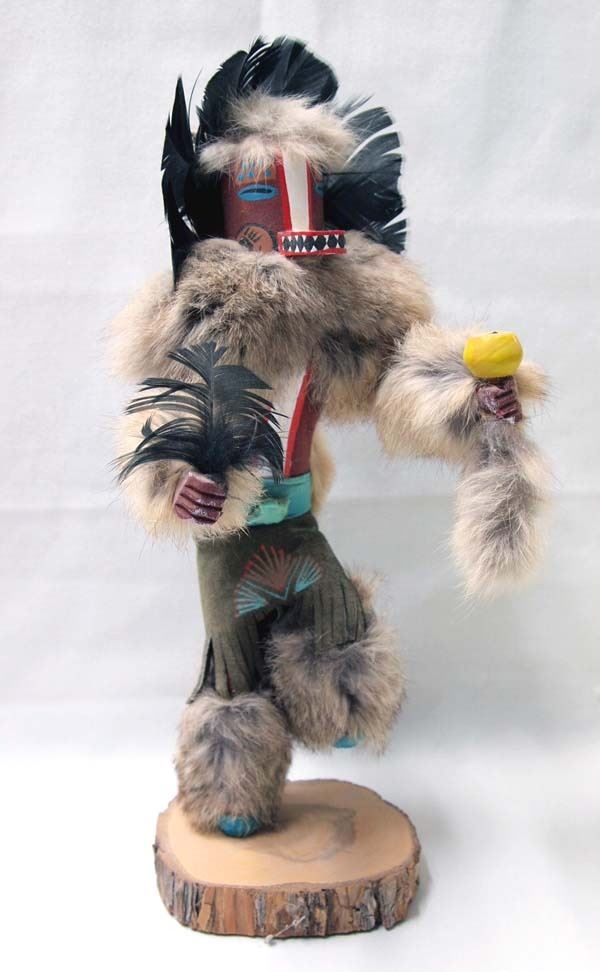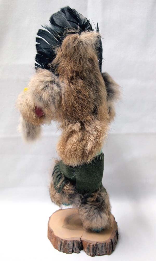 Massey Estate: Native American Navajo Badger Kachina by F. Charley, measures 13''H x 7''W x 6''Deep, signed by the artist and embellished with rabbit fur and feathers