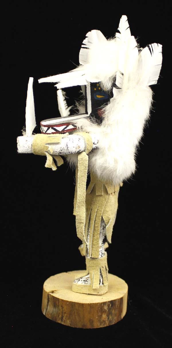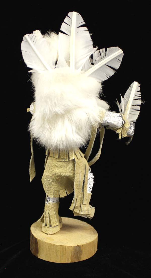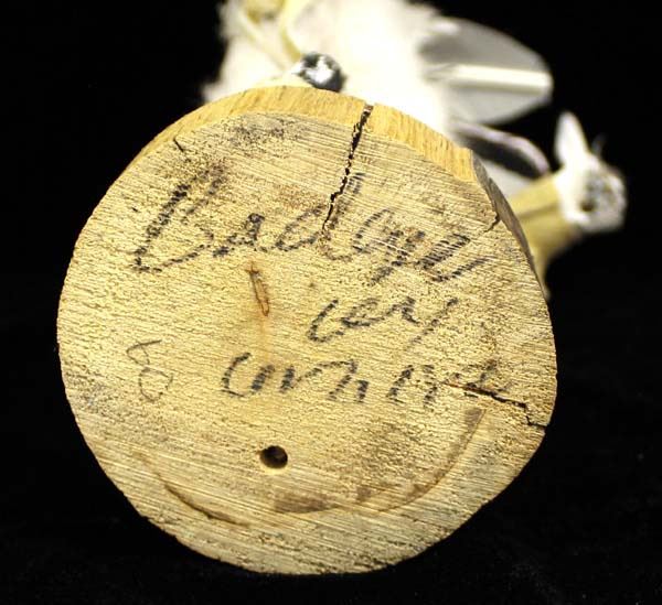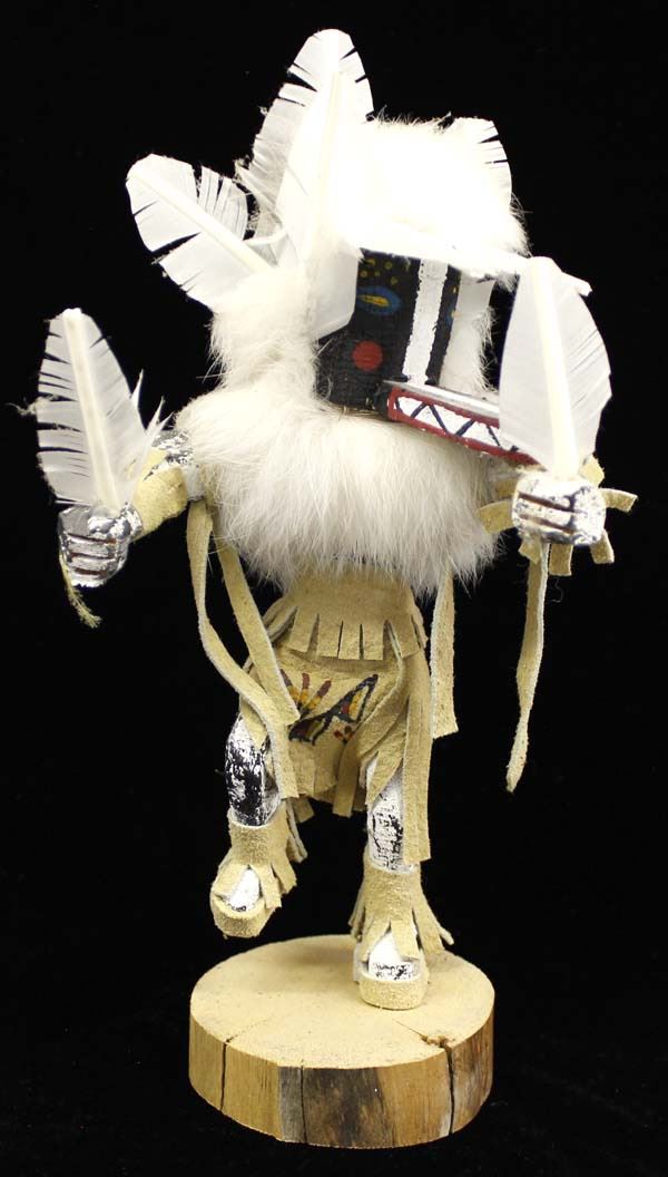 Native American Navajo Badger Kachina, signed by the artist and measures 3'' x 11'' x 5'' and is embellished with feathers, rabbit fur, and leather