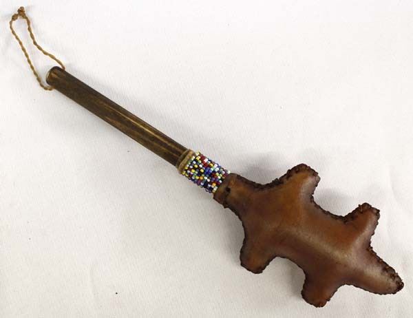 Native American Navajo Beaded Hide Turtle Rattle, measures 3'' x 10'', wood handle