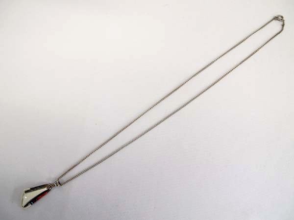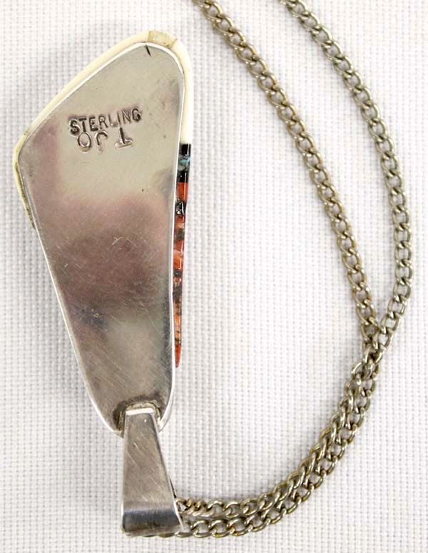 Beautiful Native American Zuni Bone Overlay Sterling Necklace by Theresa Joe, inlay of bone, coral, turquoise, and jet, pendant measures 2''L x .75''W and chain measures 22'' end to end, hallmarked and stamped sterling