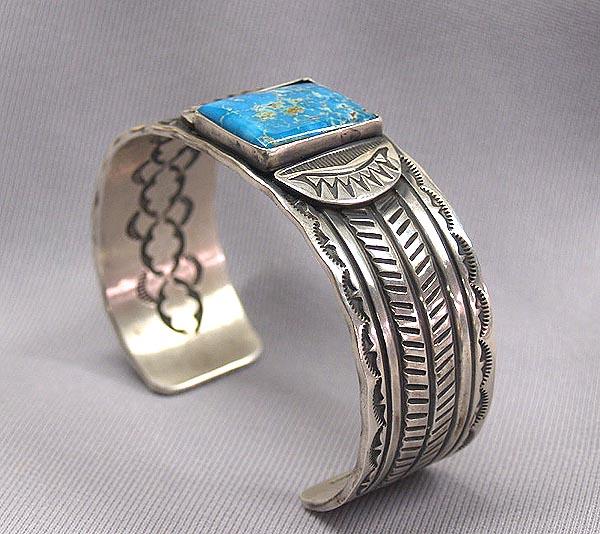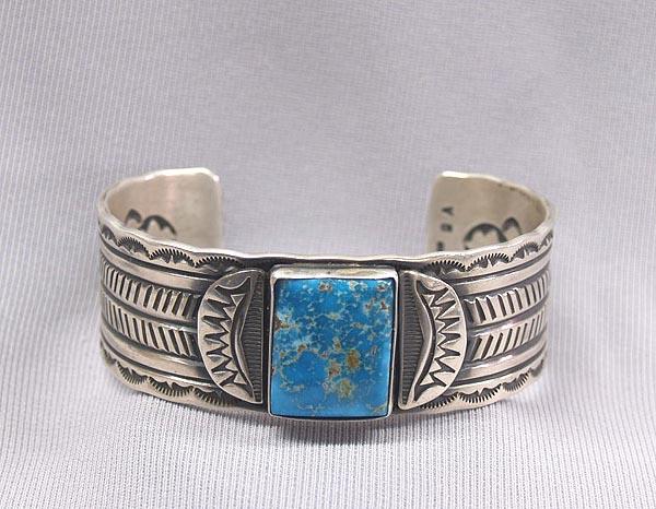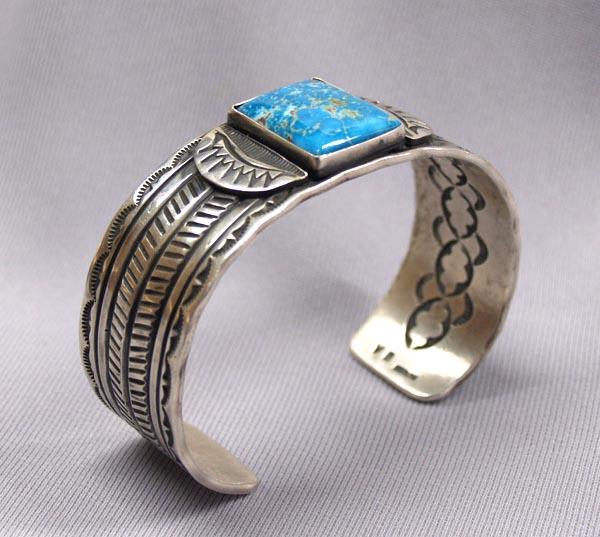 Native American Navajo Sterling Silver Turquoise Bracelet by Victor Begay, beautifully stamped inside and outside, inside measures approx. 7.5'', 1'' width, stone measures .75'' x .75''. Buyers Pay Actual Shipping and Handling Charges(see terms and conditions for more information)