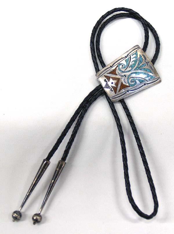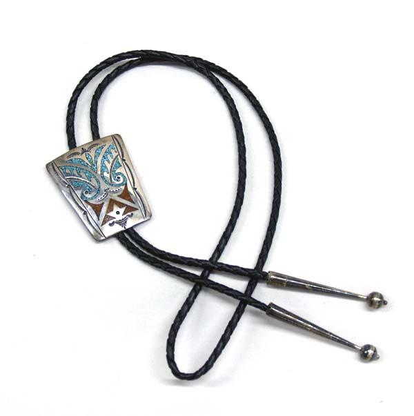 Native American Navajo Silver Turquoise Coral Chip Inlay Bolo Tie, handstamped, measures approx. 18.5''L and slide 2'' x 1 5/8''. Buyers Pay Actual Shipping and Handling Charges(see terms and conditions for more information)