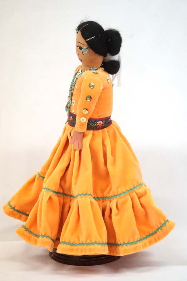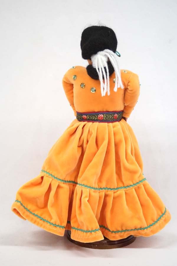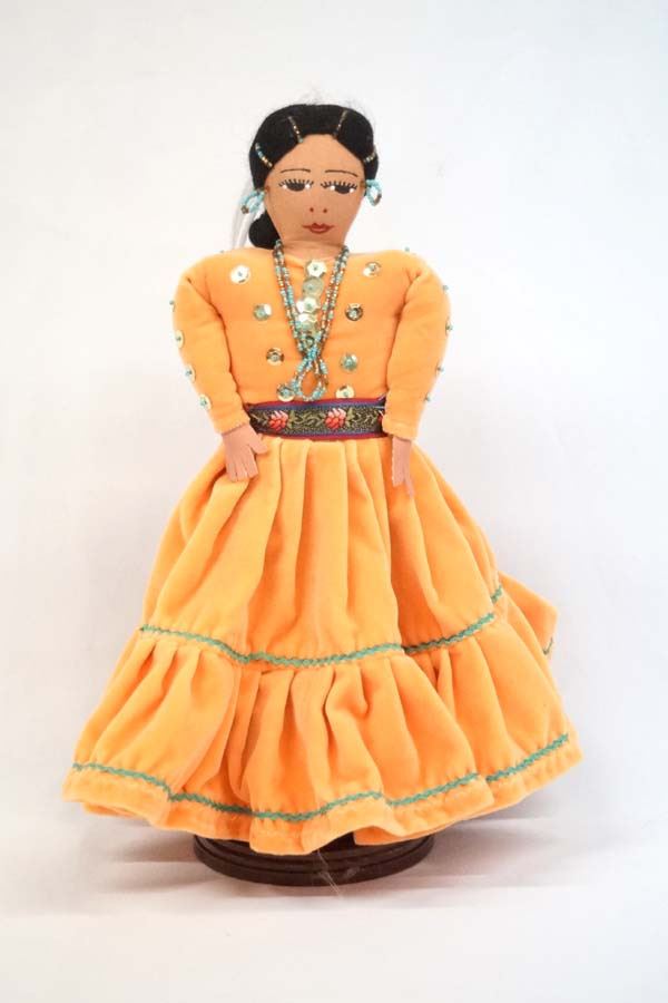 Native American Navajo Cloth Doll by Pearl Joe, signed by artist, comes with stand, measures 5''W x 13''H, clothed in traditional dress, embellished with beaded necklace & earrings and sequins