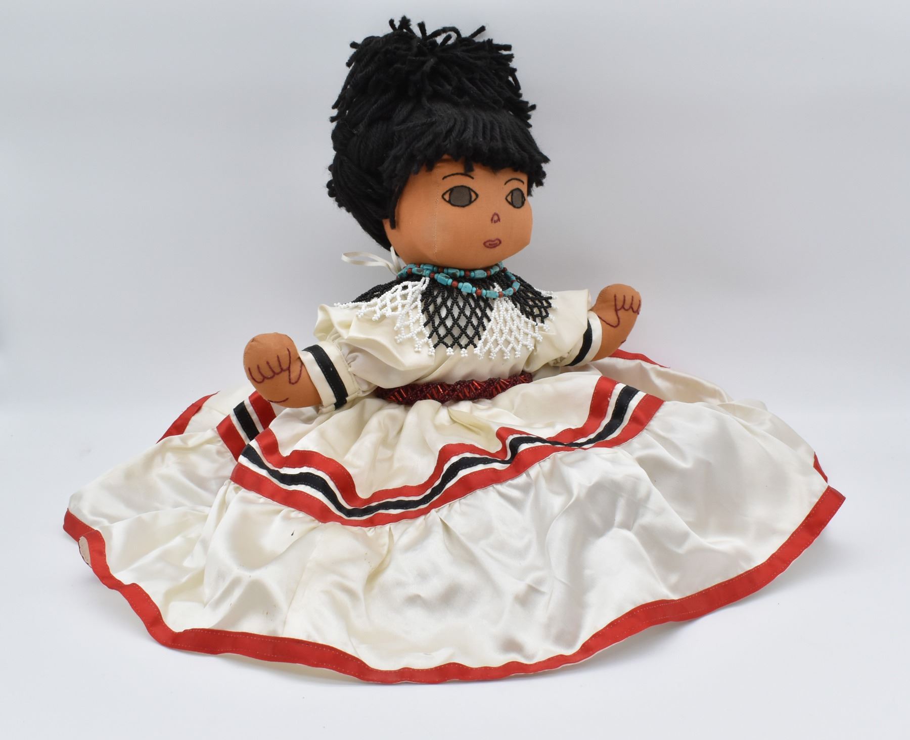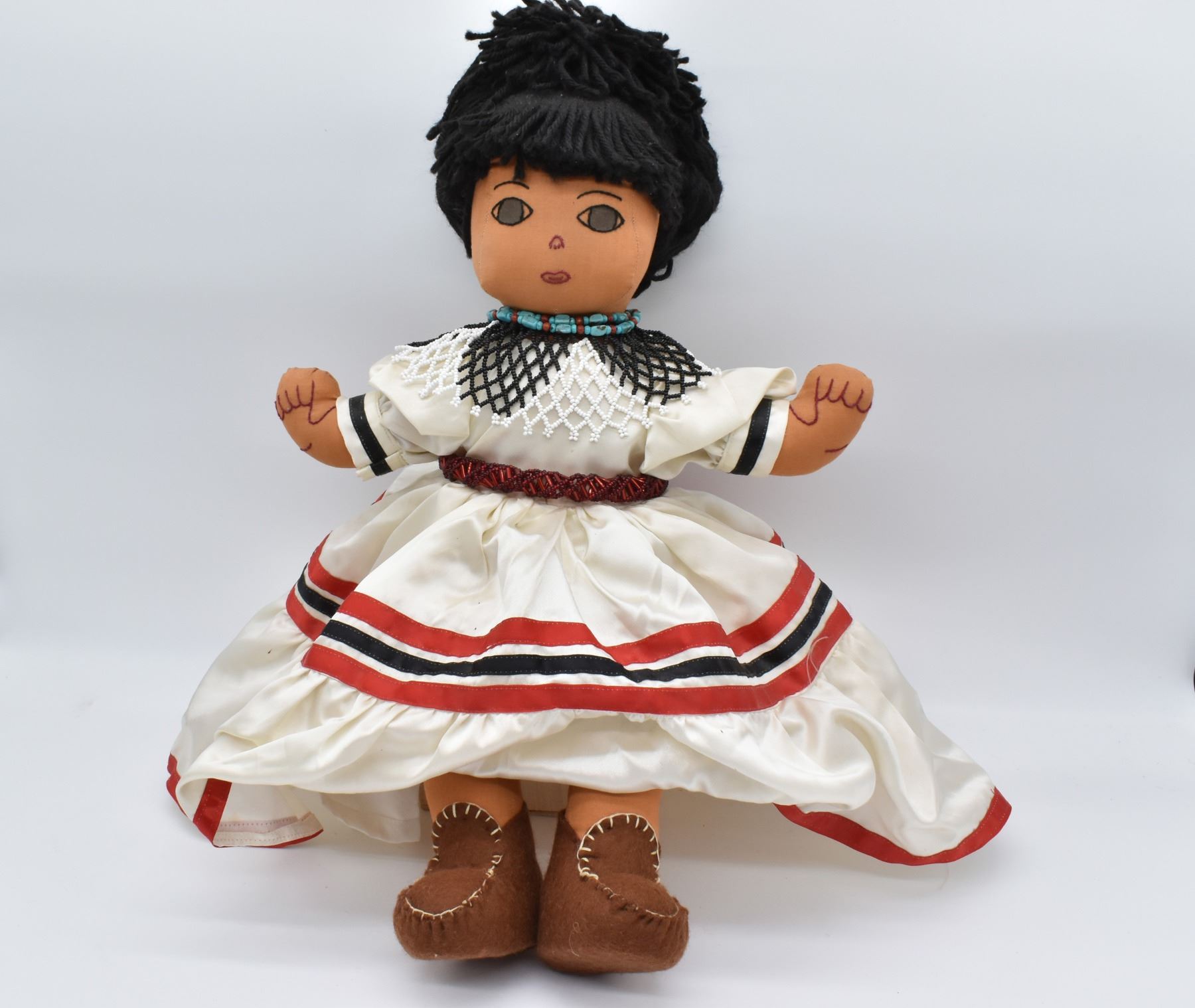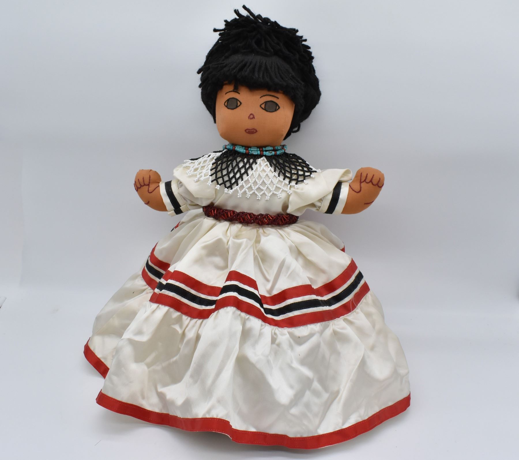 Native American Navajo Cloth Doll, wearing white satin dress, beaded collar necklace, turquoise necklace, brown felt mocassin boots, and red beaded belt, yarn hair, hand sewn face, measures 20''L