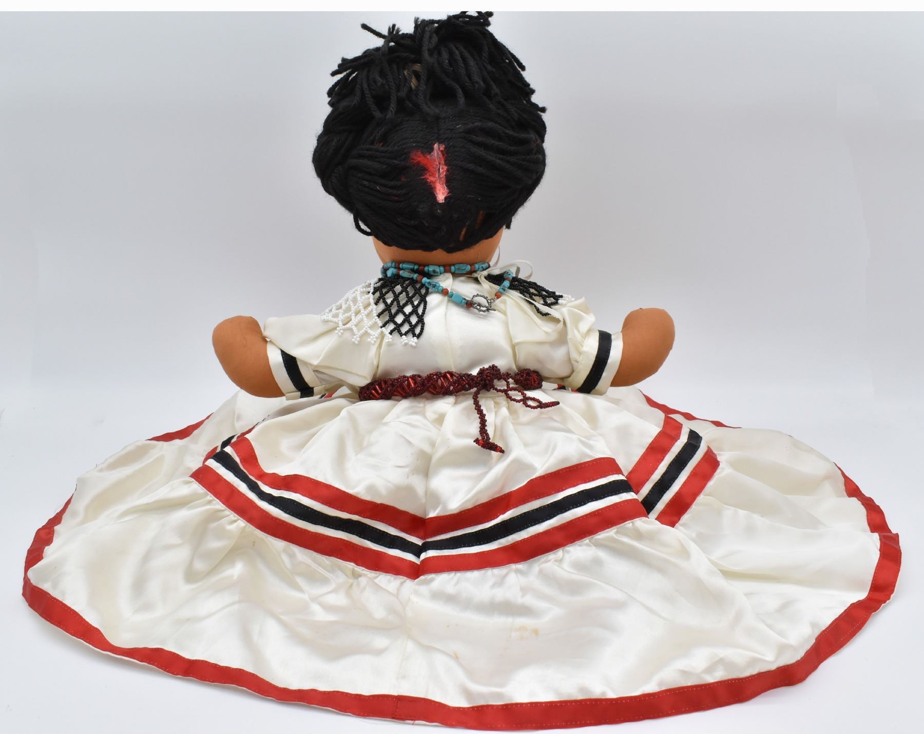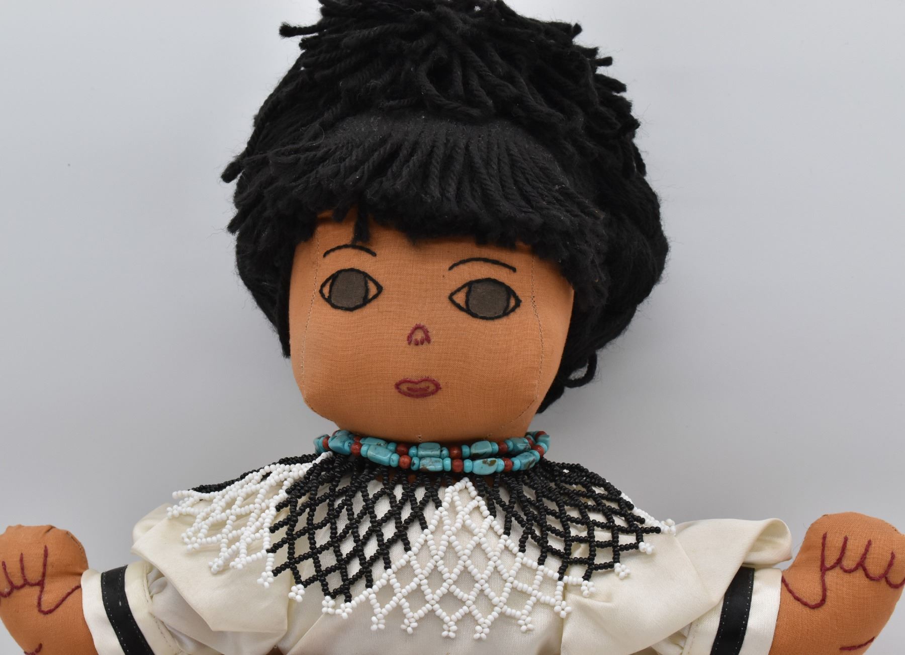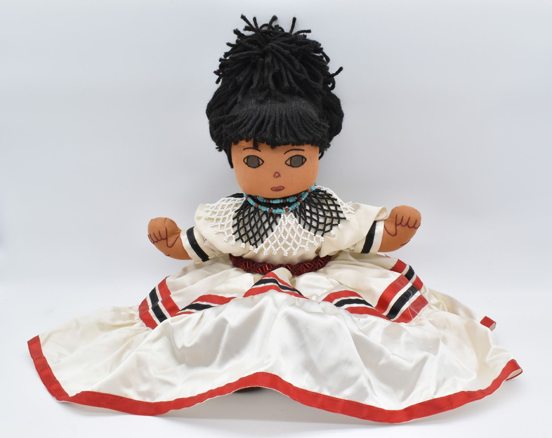Native American Navajo Cloth Doll, wearing white satin dress, beaded collar necklace, turquoise necklace, brown felt mocassin boots, and red beaded belt, yarn hair, hand sewn face, measures 20''L