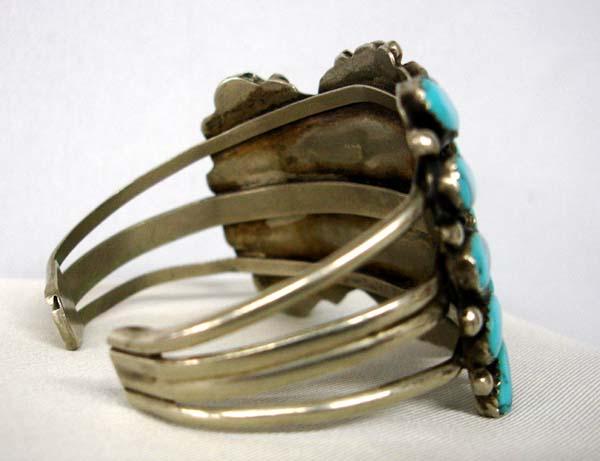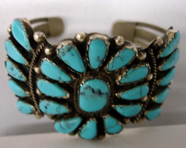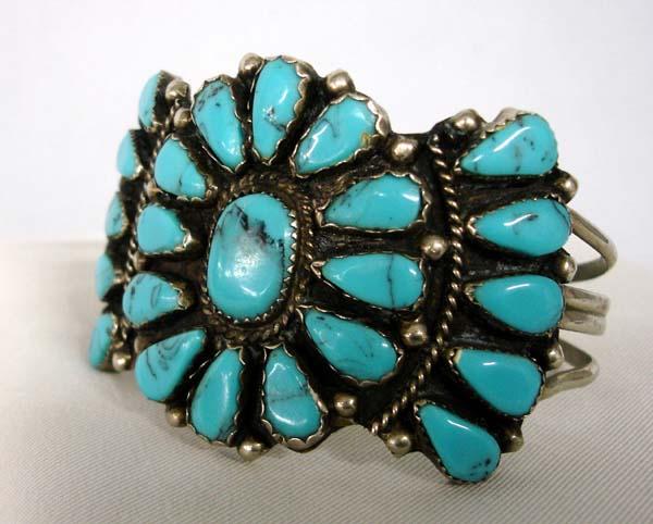 Native American Navajo Cluster Bracelet. Measures 6.25'' inside including opening. Turquoise cluster setting measures 3''x1.75''. Buyers Pay Actual Shipping and Handling Charges(see terms and conditions for more information).