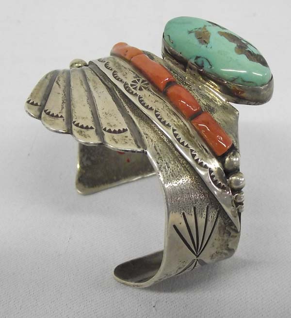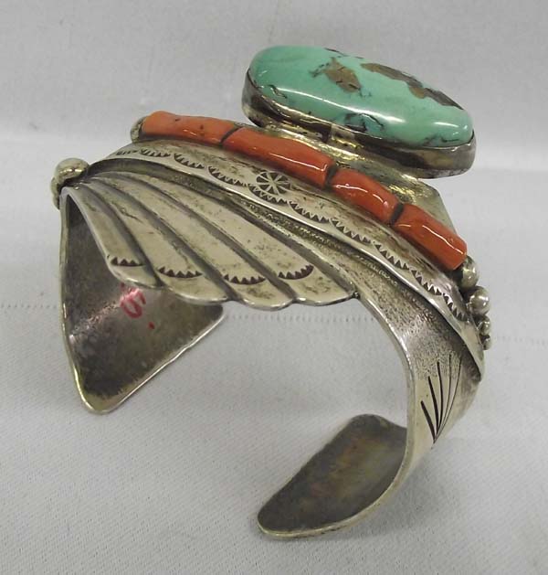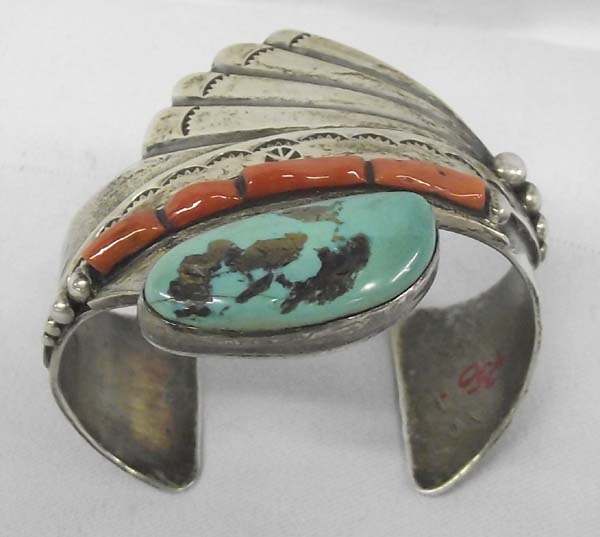 Native American Navajo Cuff Bracelet Hallmark PA. Natural Turquoise stone with coral. Measurement in Inches - Inside Length(Including Opening) 6 1/2'' x 2''Width, turquoise stone measures approx. 1/2'' x 1 1/4''. Buyers Pay Actual Shipping and Handling Charges(see terms and conditions for more information).