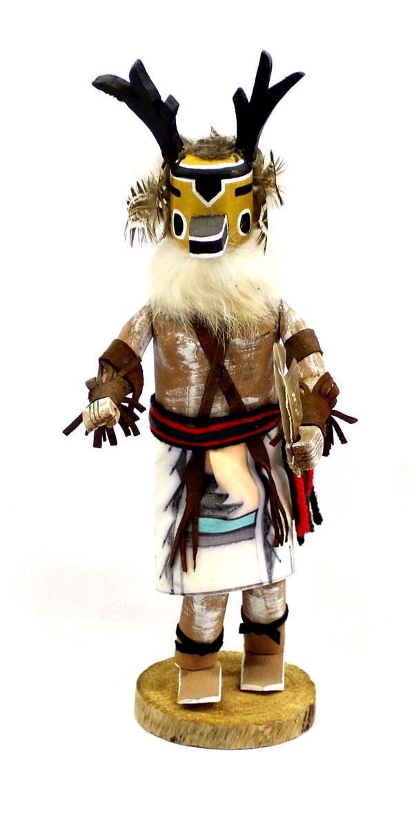 Native American Navajo Deer Kachina by Largo, measures 4'' x 11'' x 5'' and is signed by the artist, embellished with feathers, leather, and yarn