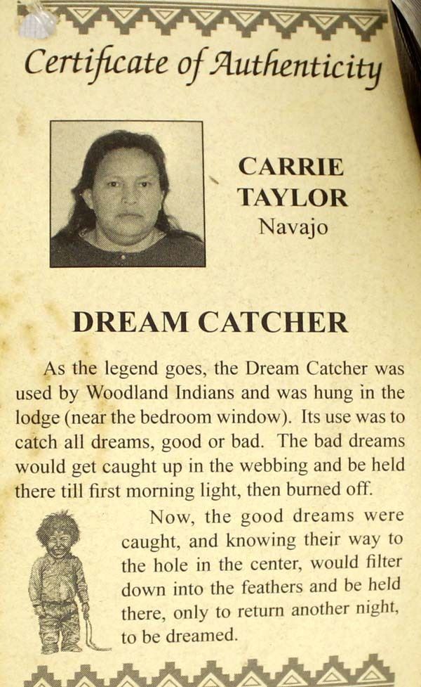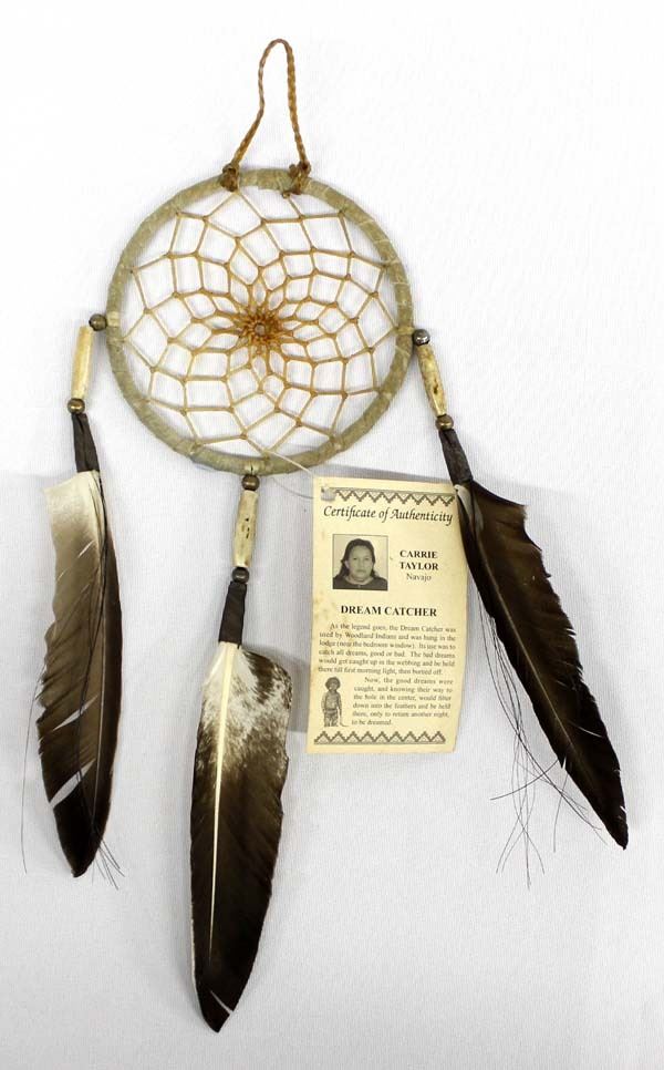 Native American Navajo Dreamcatcher by Carrie Taylor, measures 12.5'' x 4.5'' and is embellished with horse hair, leather, feathers, and beads