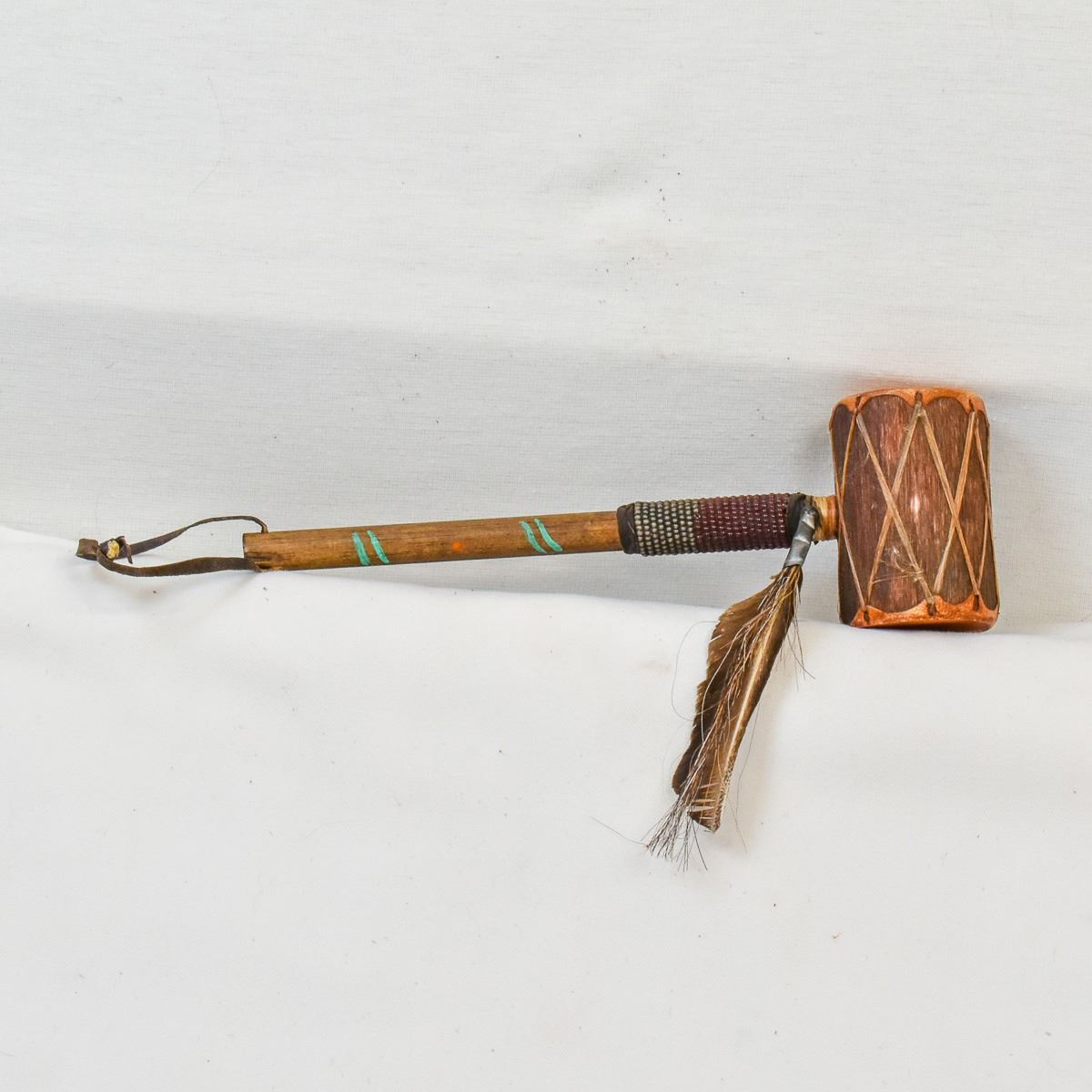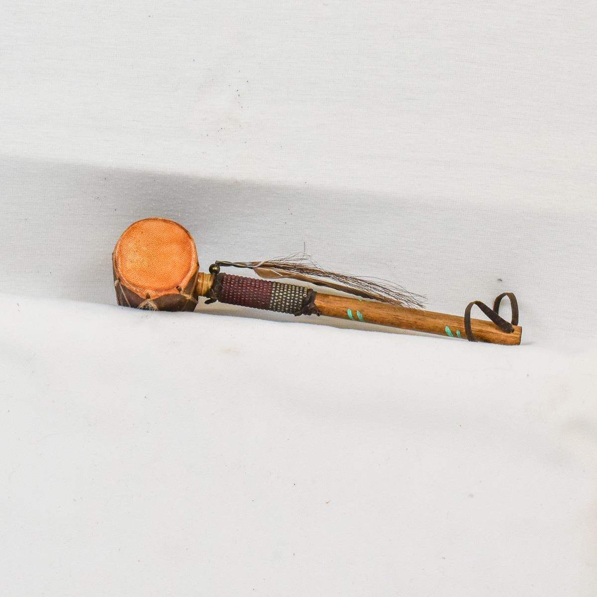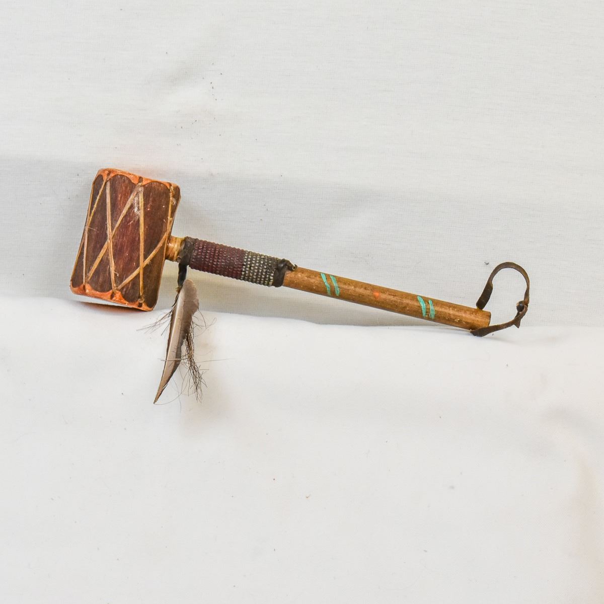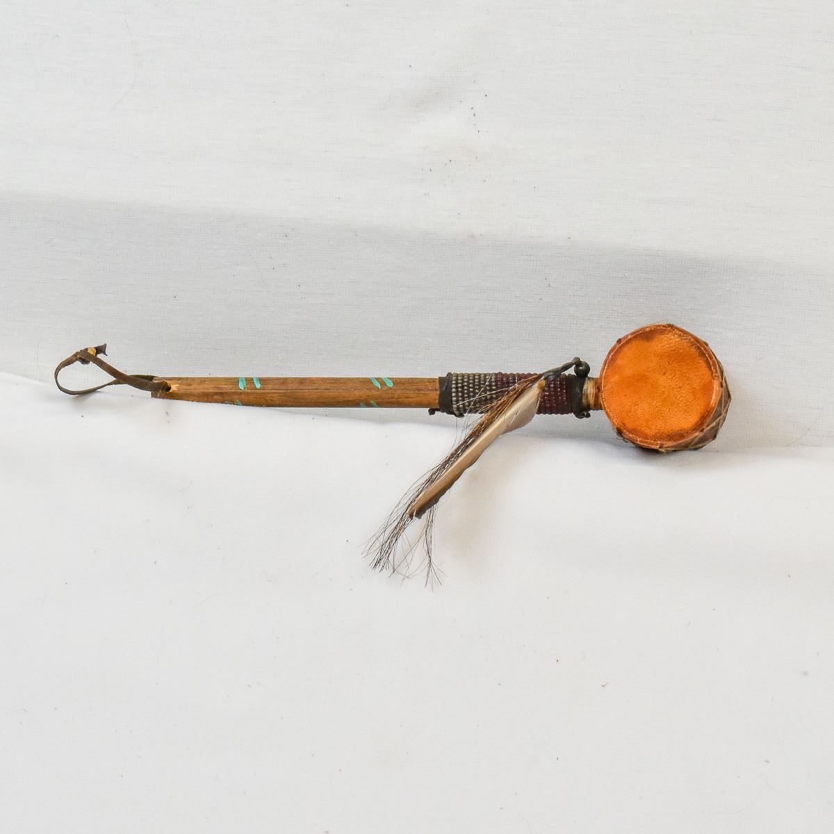 Native American Navajo Drum Rattle, measures 3'' x 9'' x 2'', embellished with single feather and horse hair, the wood handle has a few painted lines on it