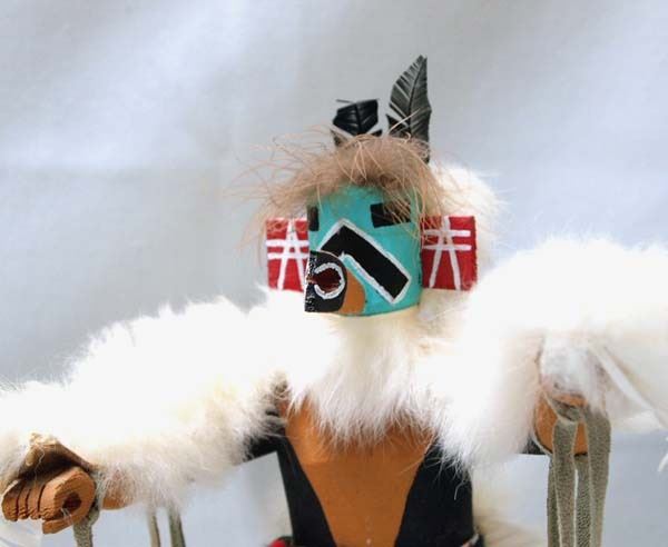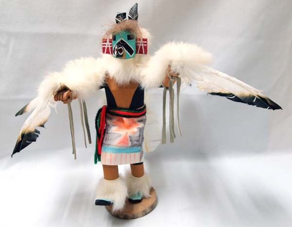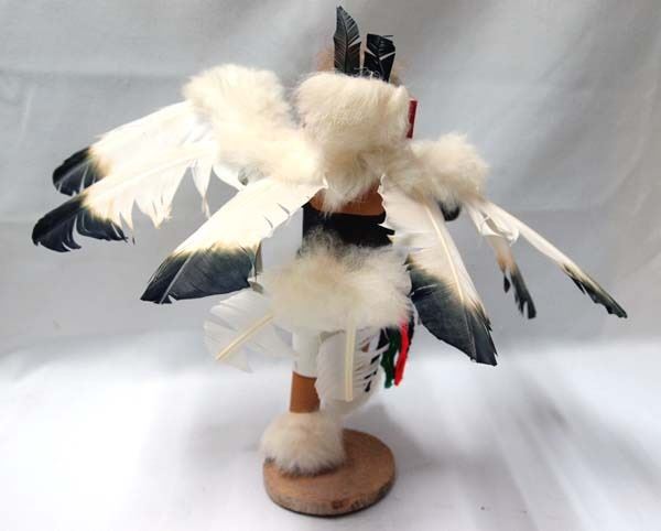 Massey Estate: Native American Navajo Eagle Kachina by Largo, measures 10.5''H x 15''W x 9''Deep and signed by the artist, embellished with feathers, rabbit fur, and leather