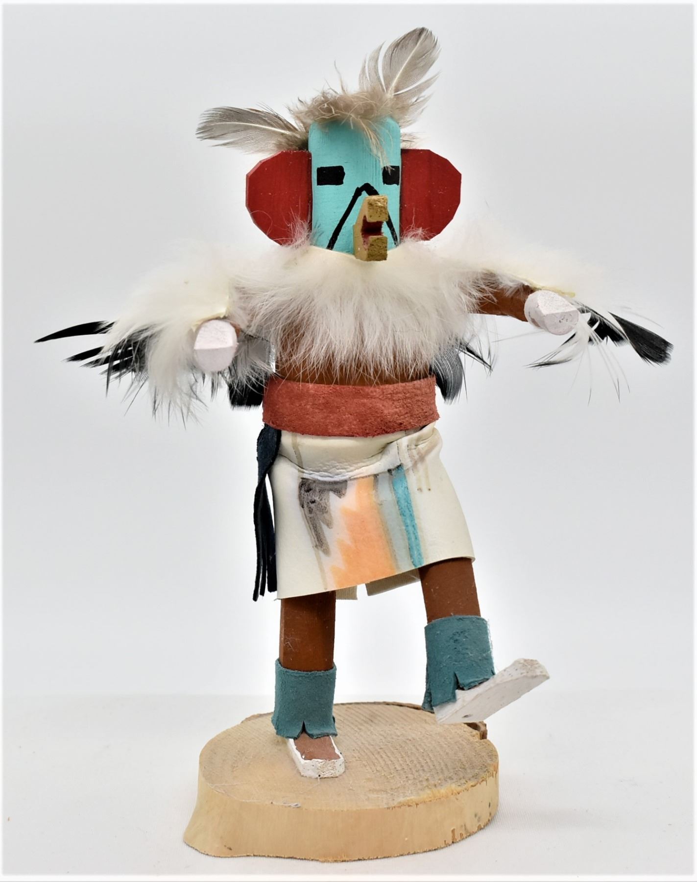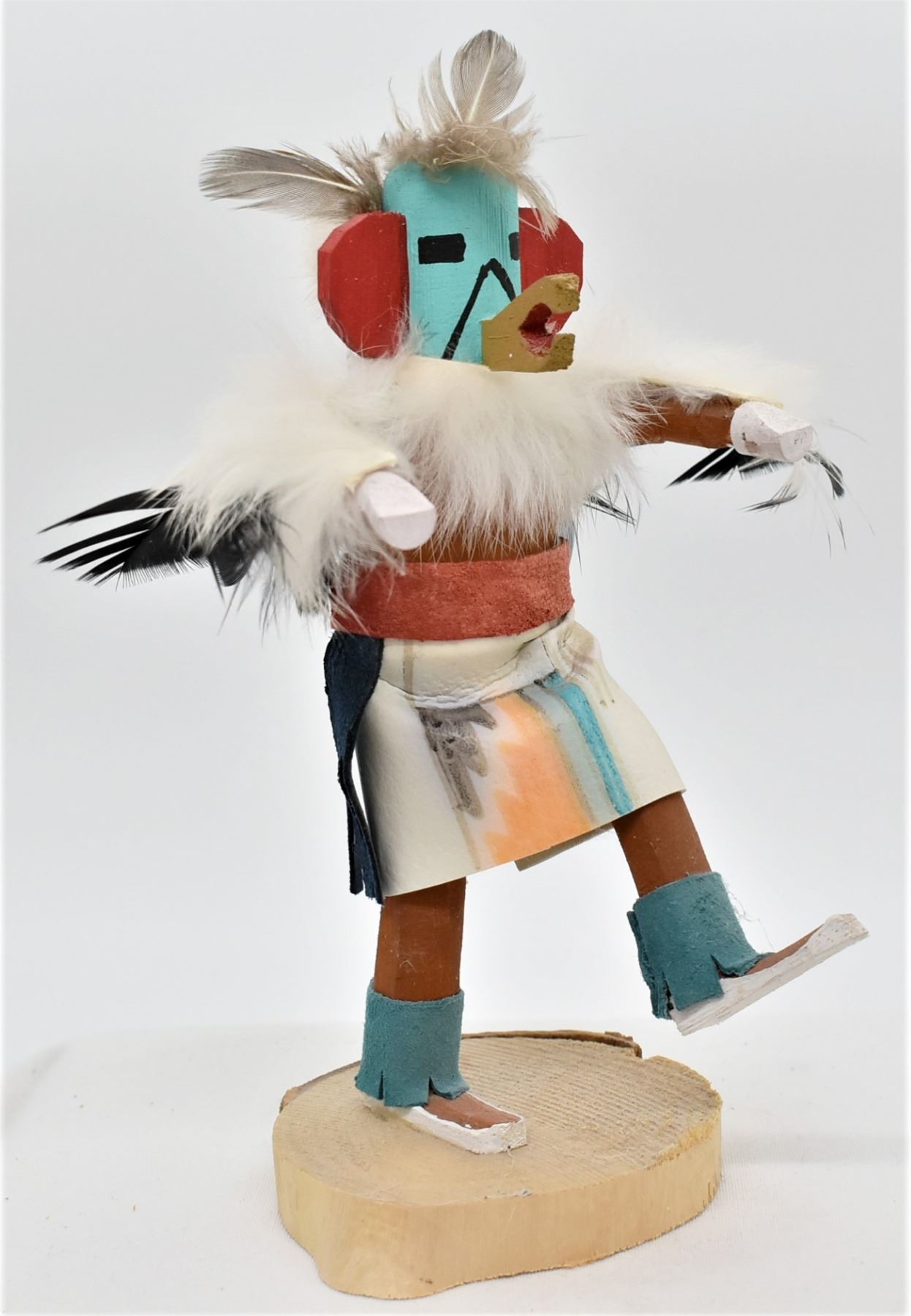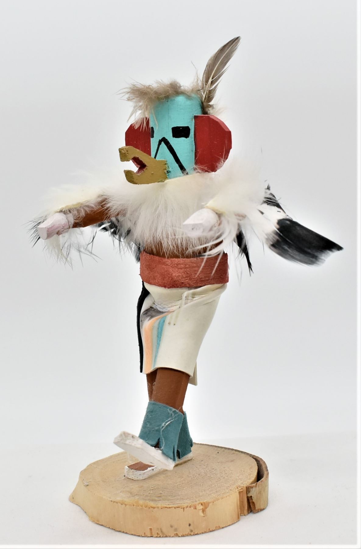 Native American Navajo Eagle Kachina, measures 7'' x 6'' and has artist's intials K.B. on the bottom, embellished with feathers, rabbit fur, painted cloth, and leather