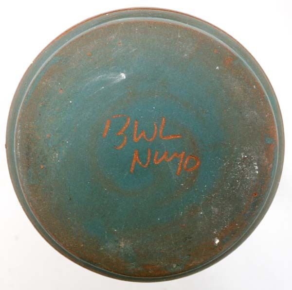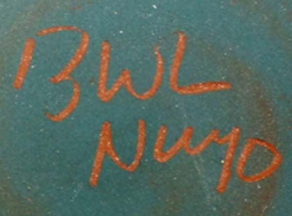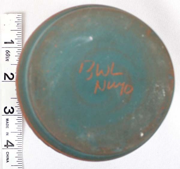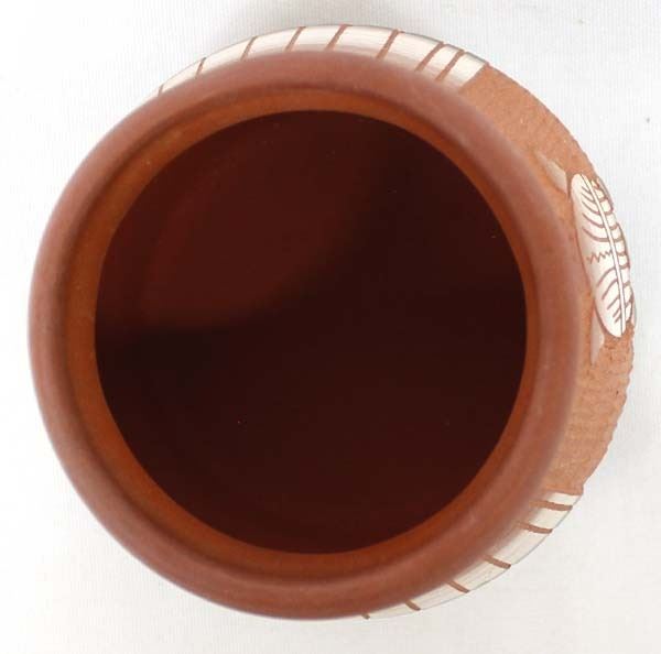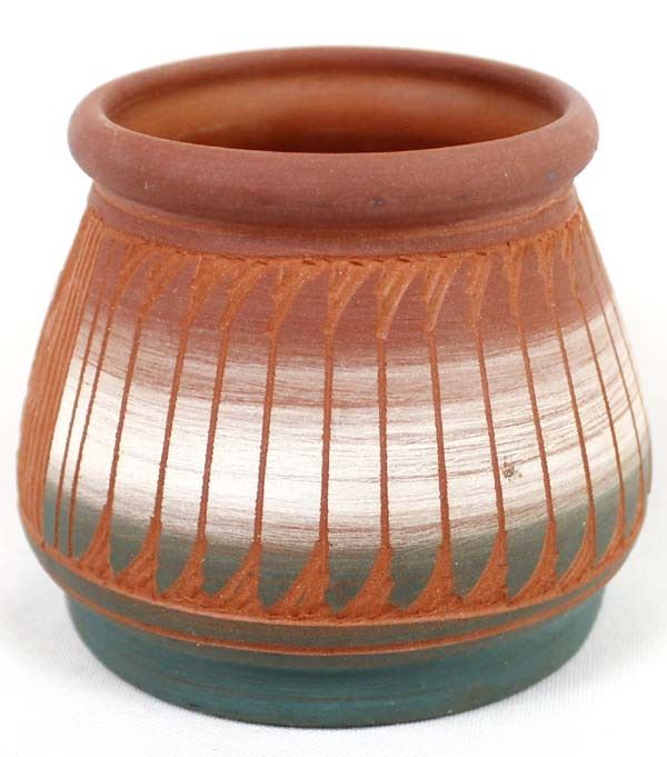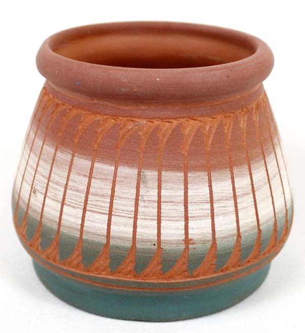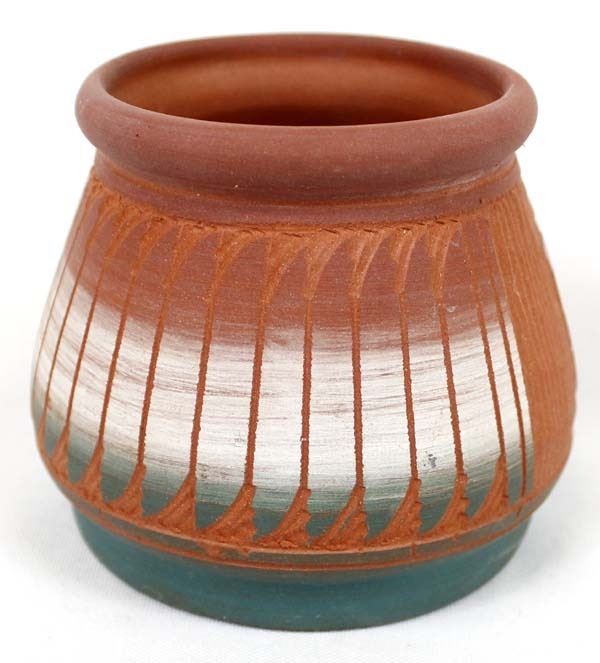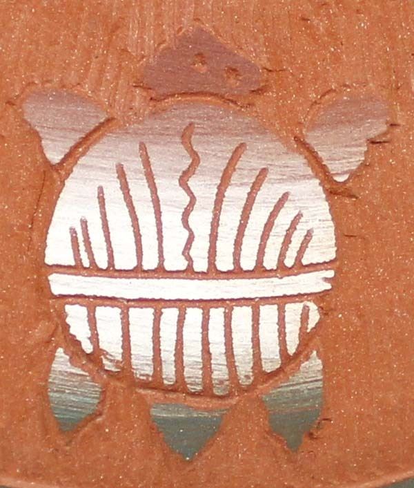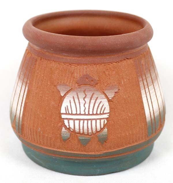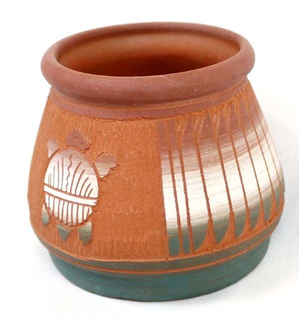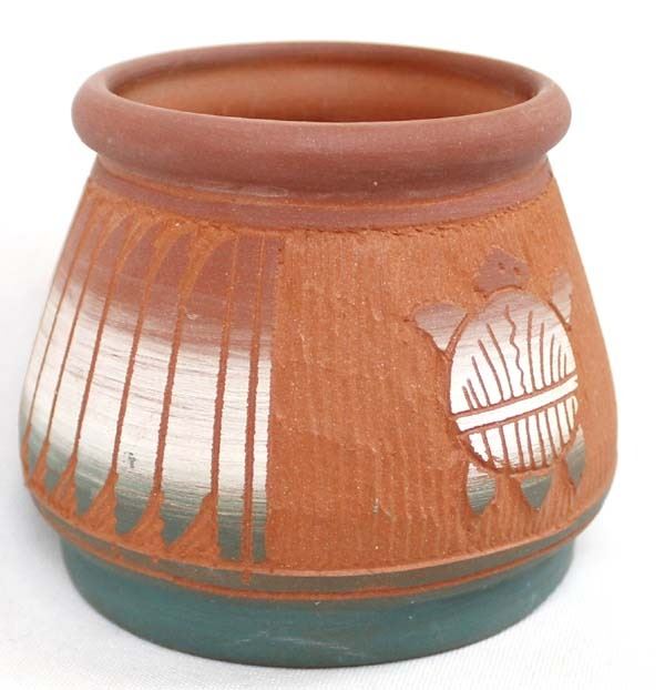 Native American Navajo Etched Pottery Jar, artist's initials BWL on the bottom, measures 3.5'' x 3.5'', turtle and Knifewing Mountains motif