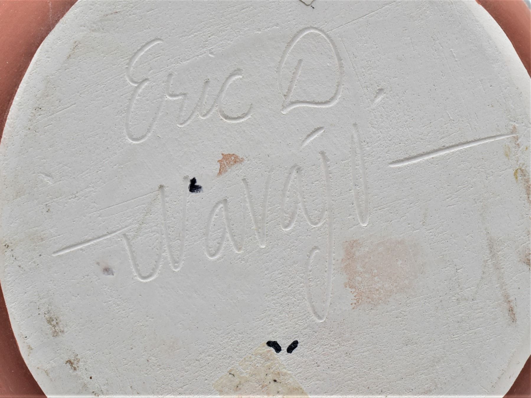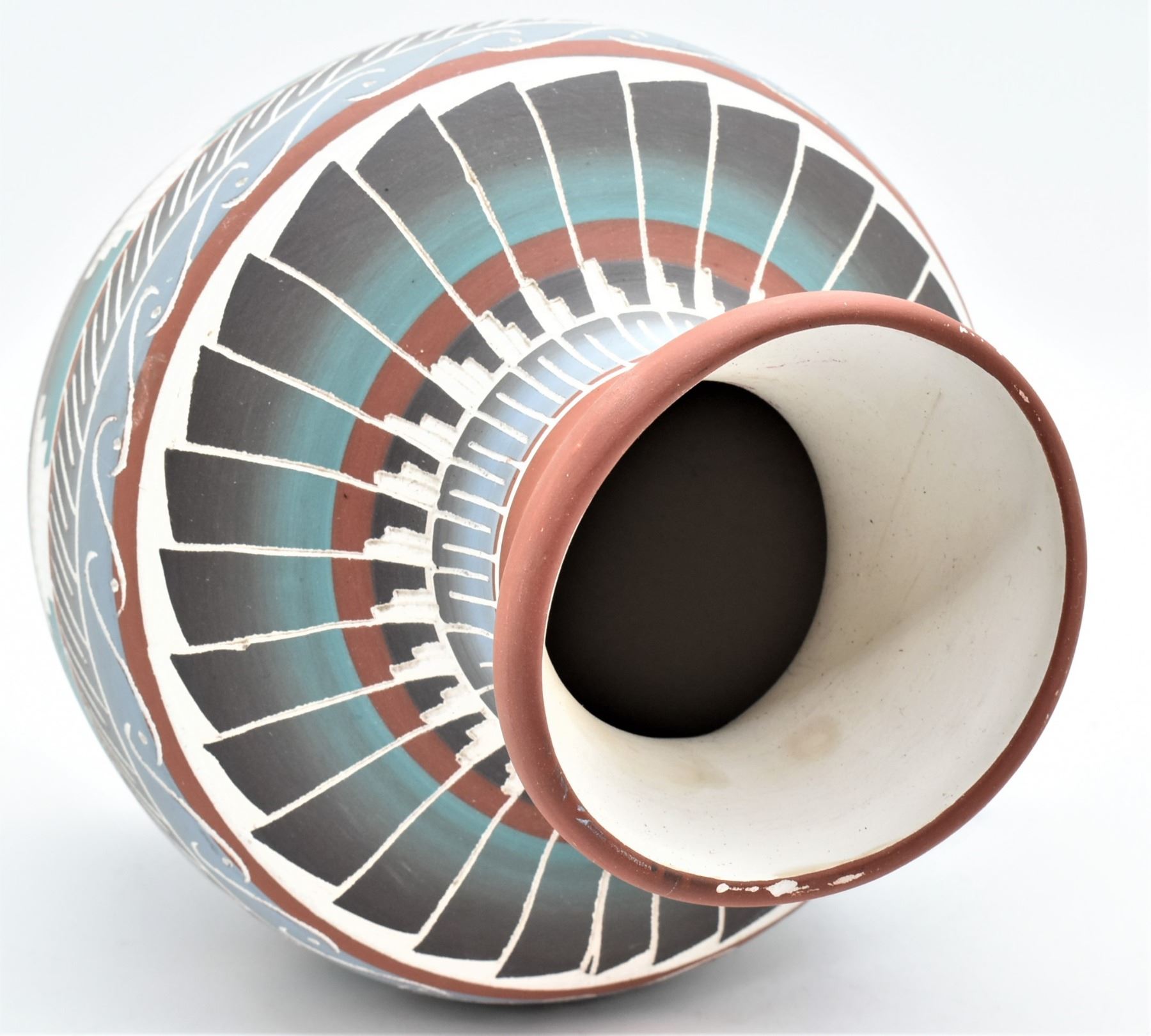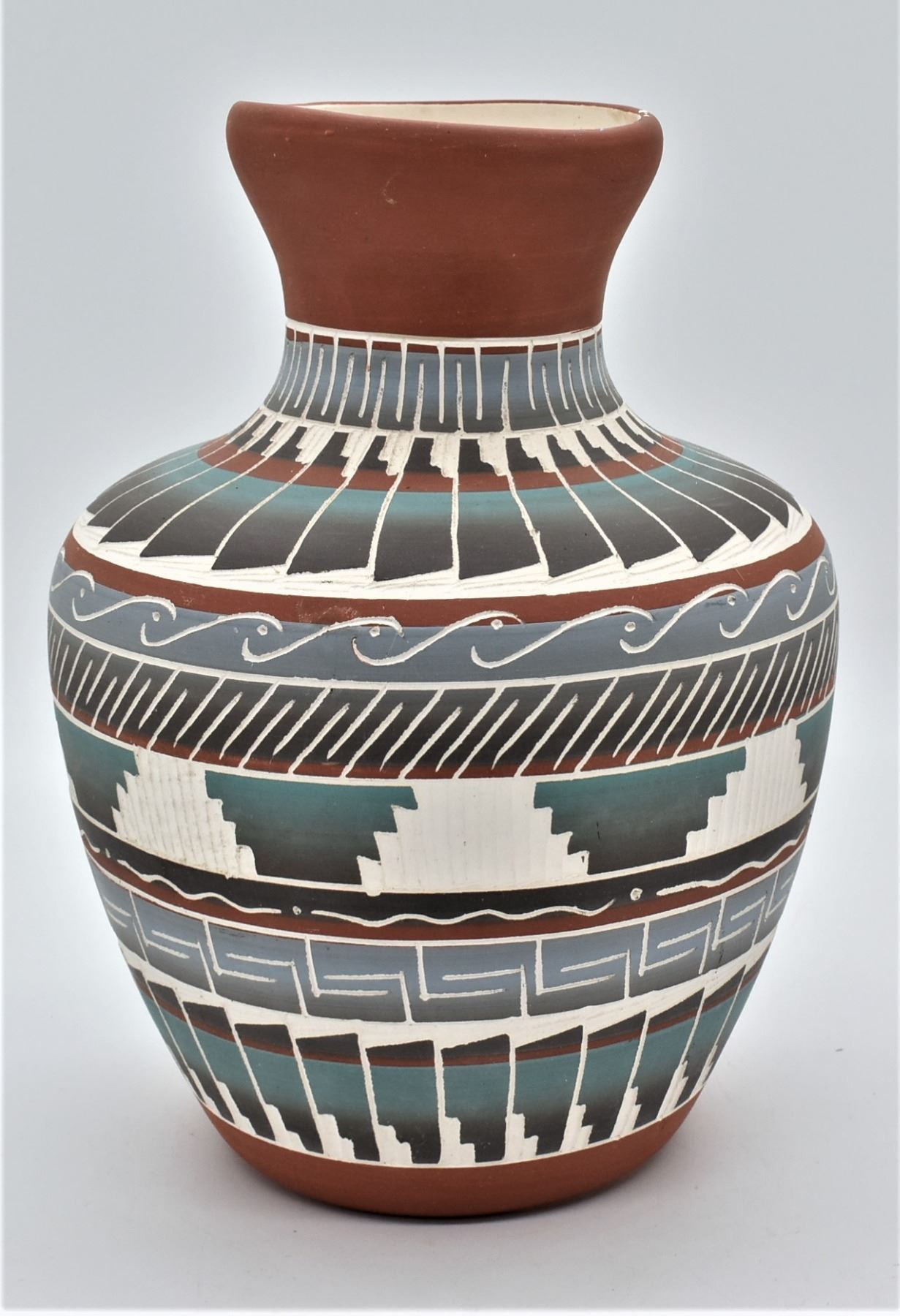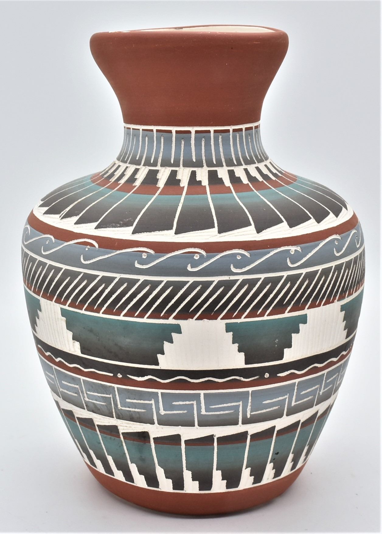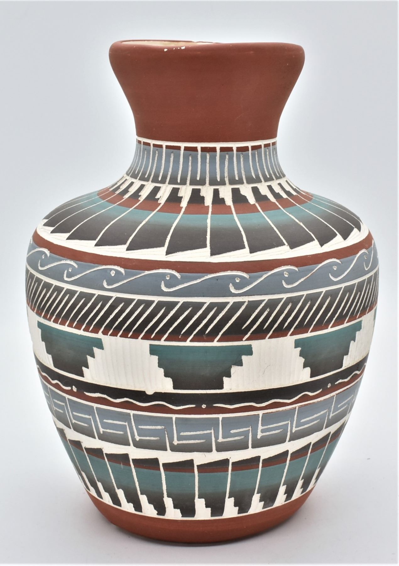 Native American Navajo Etched Pottery Vase, signed Eric D. on the bottom, beautiful colors, measures 7'' x 10''