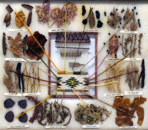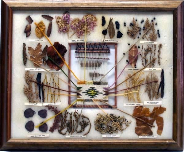 Native American Navajo Framed Dye Chart, natural plants, bark, roots, nuts, and flower arrangement including a partial rug sampler. Visual measures approx. 15.5'' x 19.5''. Buyers Pay Actual Shipping and Handling Charges(see terms and conditions for more information).