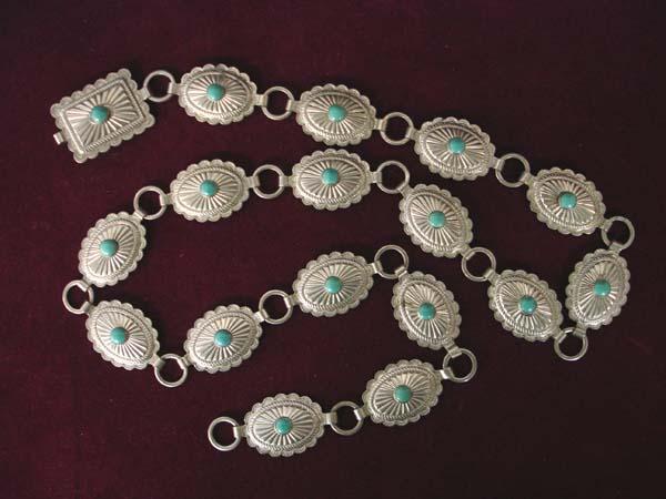 Navajo German Silver and Turquoise Concho Belt. Measures 34'' long. Center rectangular concho is 1.5''x1.25''. Buyers Pay Actual Shipping and Handling Charges(see terms and conditions for more information).