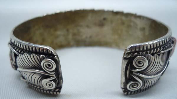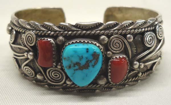 Native American Navajo Repousse with Turquoise and Coral stones, Hallmark ''E'' Bracelet. Measurement in Inches - Inside Length(Including Opening) 6'' x 3/4'' Width. Buyers Pay Actual Shipping and Handling Charges(see terms and conditions for more information).