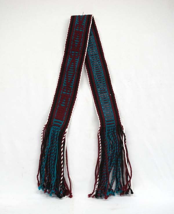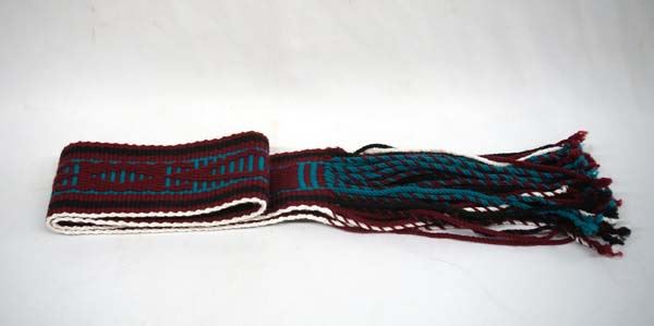 Native American Navajo Hand Woven Dance Sash, measures 52''L x 3''W, vibrant colors of teal, maroon, white, and black