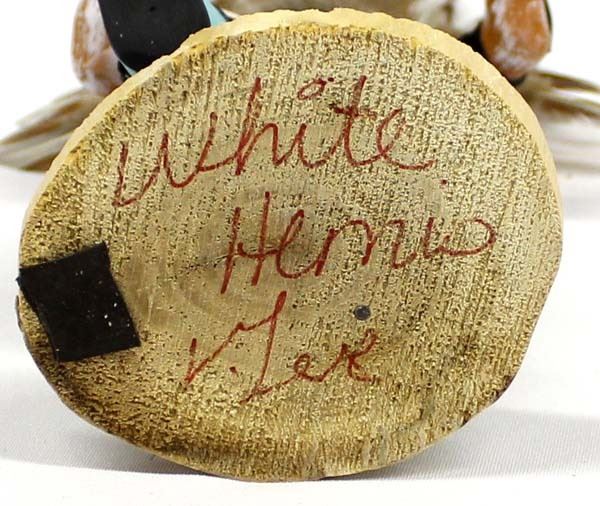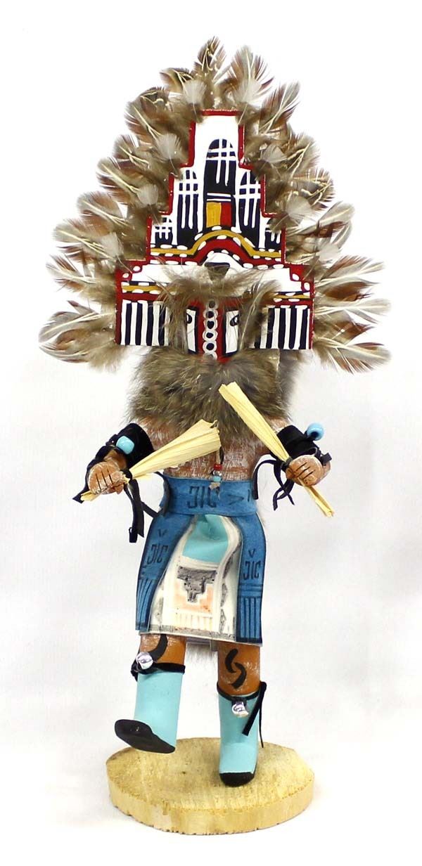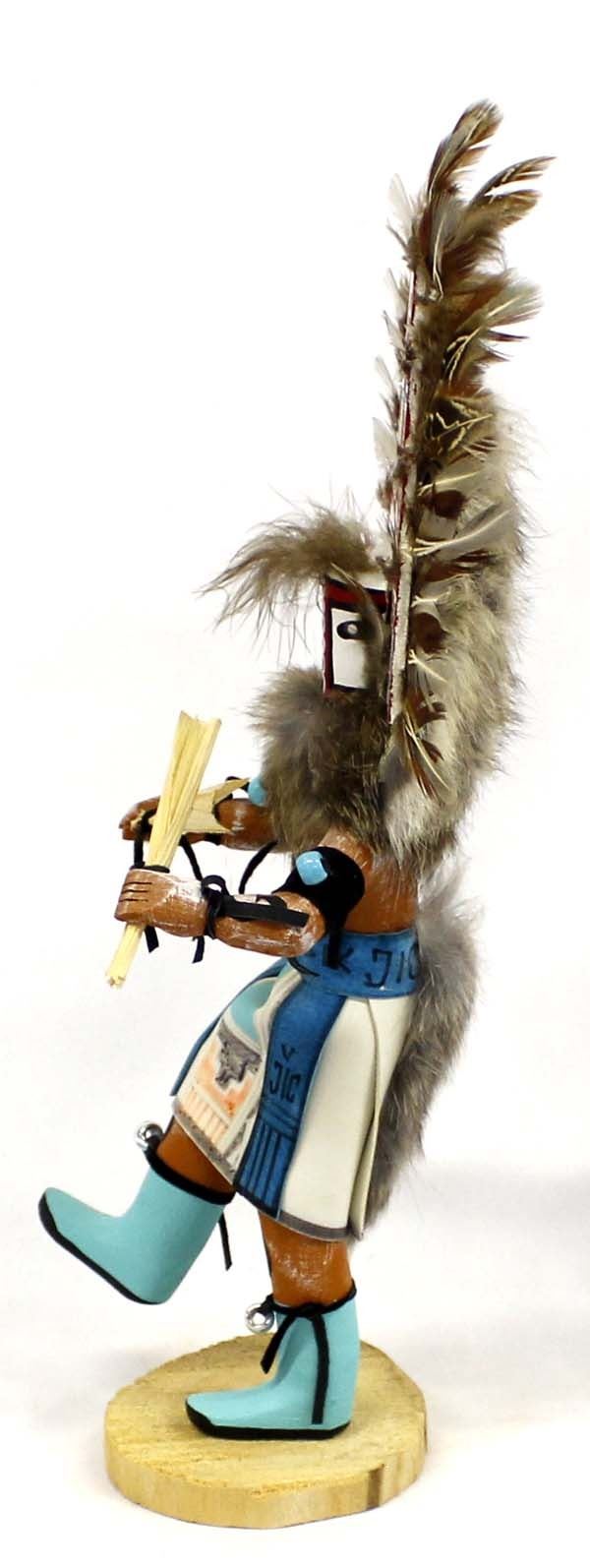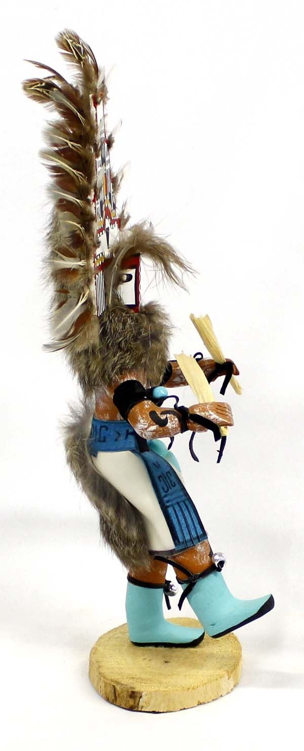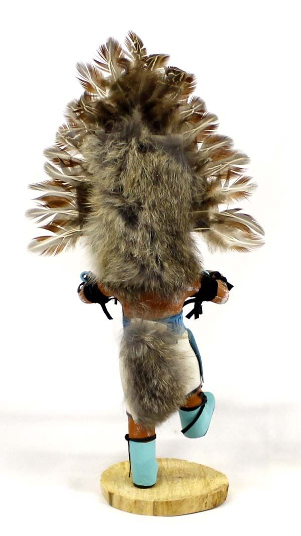 Native American Navajo Hemis Kachina, measures 14.5'' x 7'' x 3.5'', embellished with feathers, rabit fur, cornhusks, beads, leather, and yarn