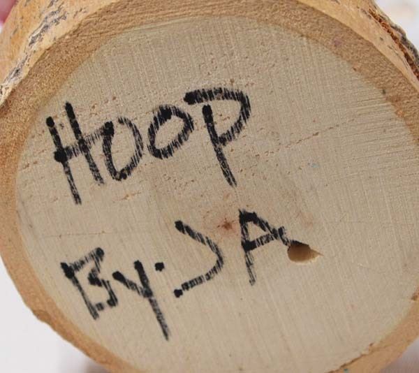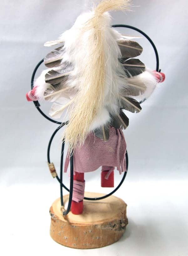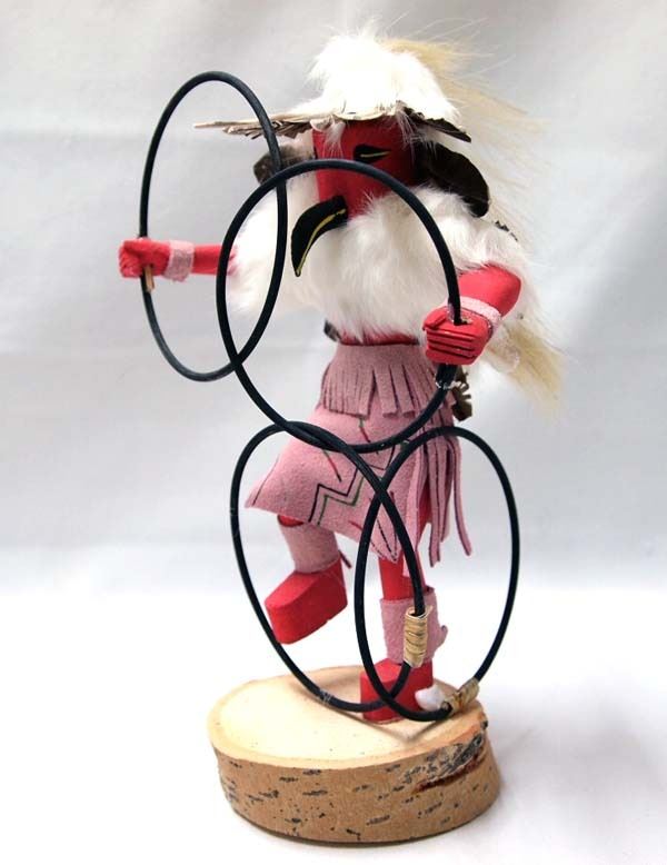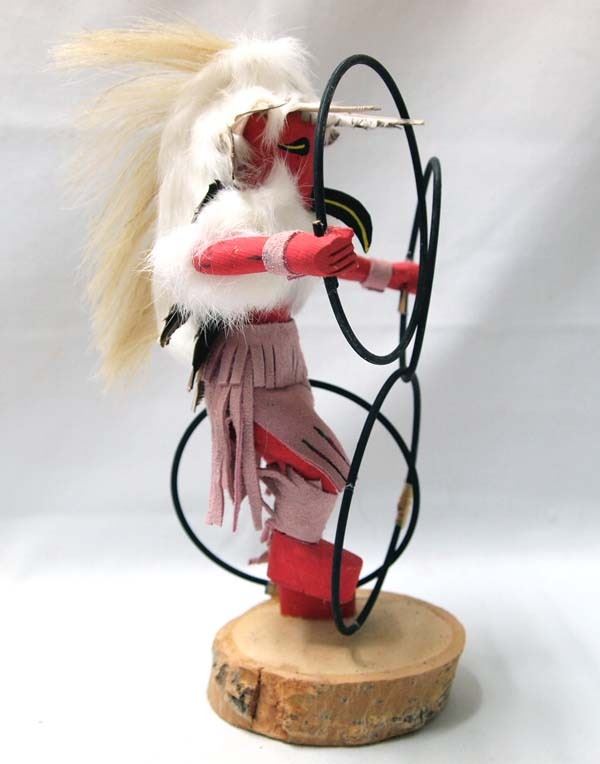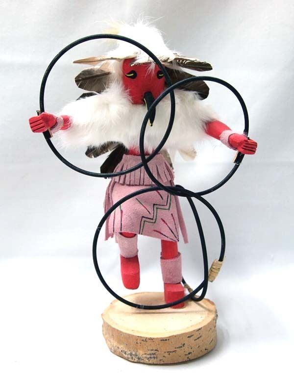 Native American Navajo Hoop Dancer Kachina, measures 7''W x 10''H x 6.5''Deep, artist's initials J. A. on the bottom, embellished with leather, feathers, and fiber